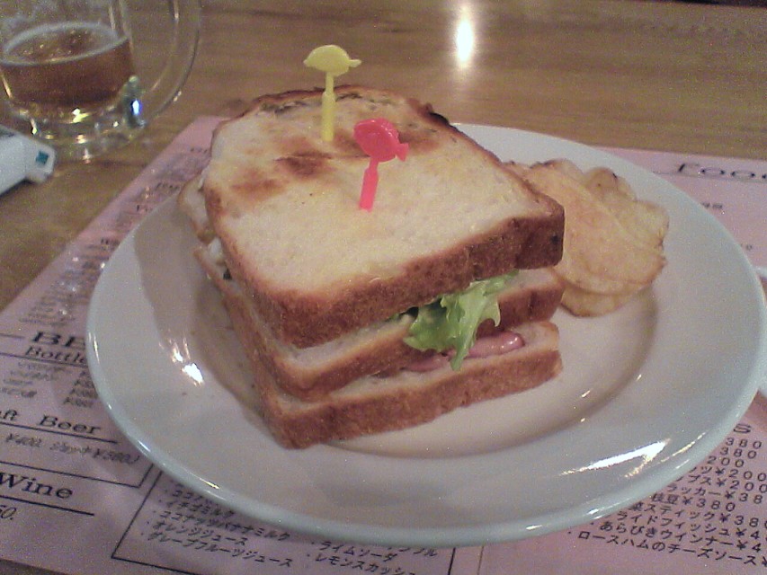 ステージが入り口側にあるので、演者の後ろにある窓の向こうを普通に人々が行き交い、なかなかシュール。覗き込む人もちらほらいて、密閉空間なのが当たり前のライブハウスとはちがって、妙にくだけた雰囲気。ややすると、テーブルに注文したチキンクラブサンドイッチ(530円)が運ばれてきた。