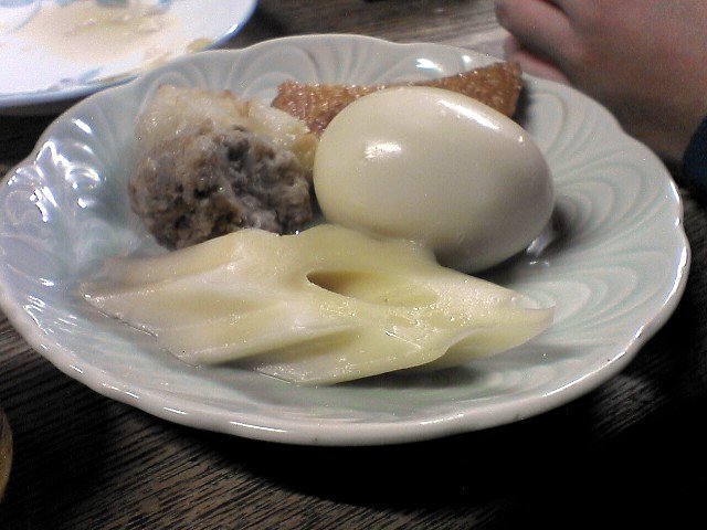 煮玉子:味はかなりしっかりついてる。で、かなり固い。全体がハードボイルド。台湾では煮玉子は固ければ固いほど喜ばれるそうで。黄身の味が凝縮してて旨い。