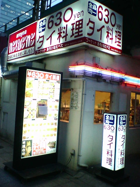 有楽町にてツレとエスニックなものでも食おうかと考える。ビッグカメラを左手にガード下をホテホテとひたすら歩く。洒落たイタリアンの店やカンコク料理の店はスルーして東京駅方面にひたすら歩くと「全品630yenタイ料理」とでっかく書かれた看板が目に入る。目的の店「あろいなたべた」だ。