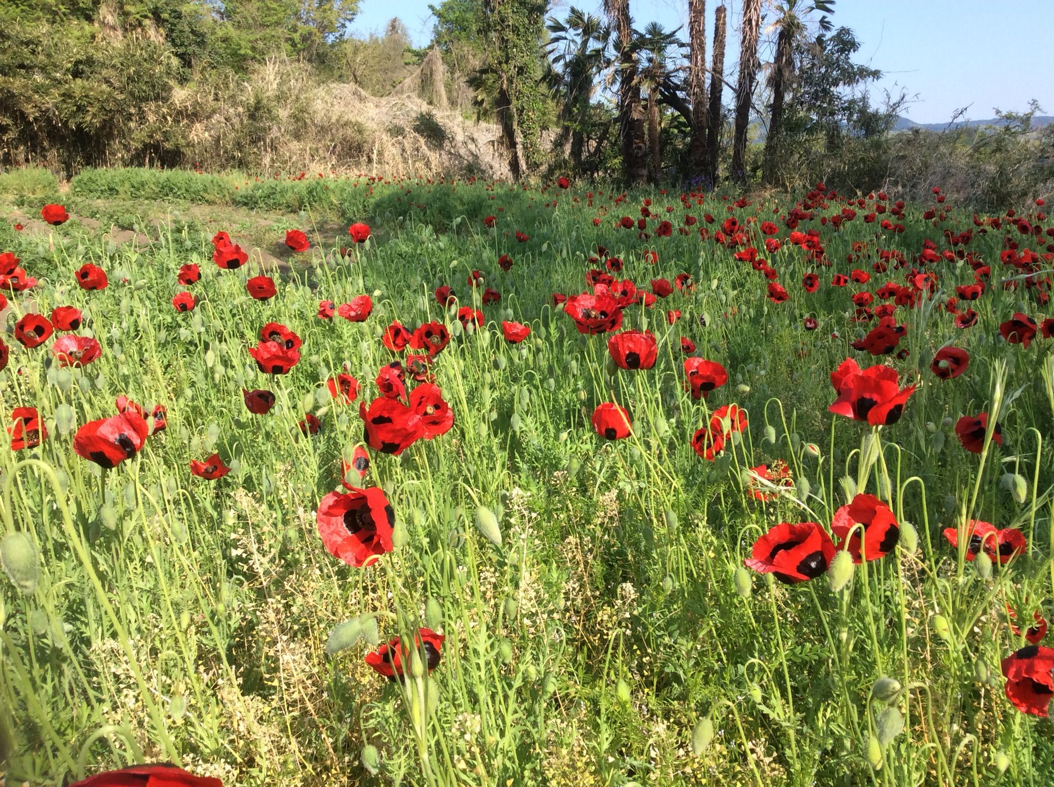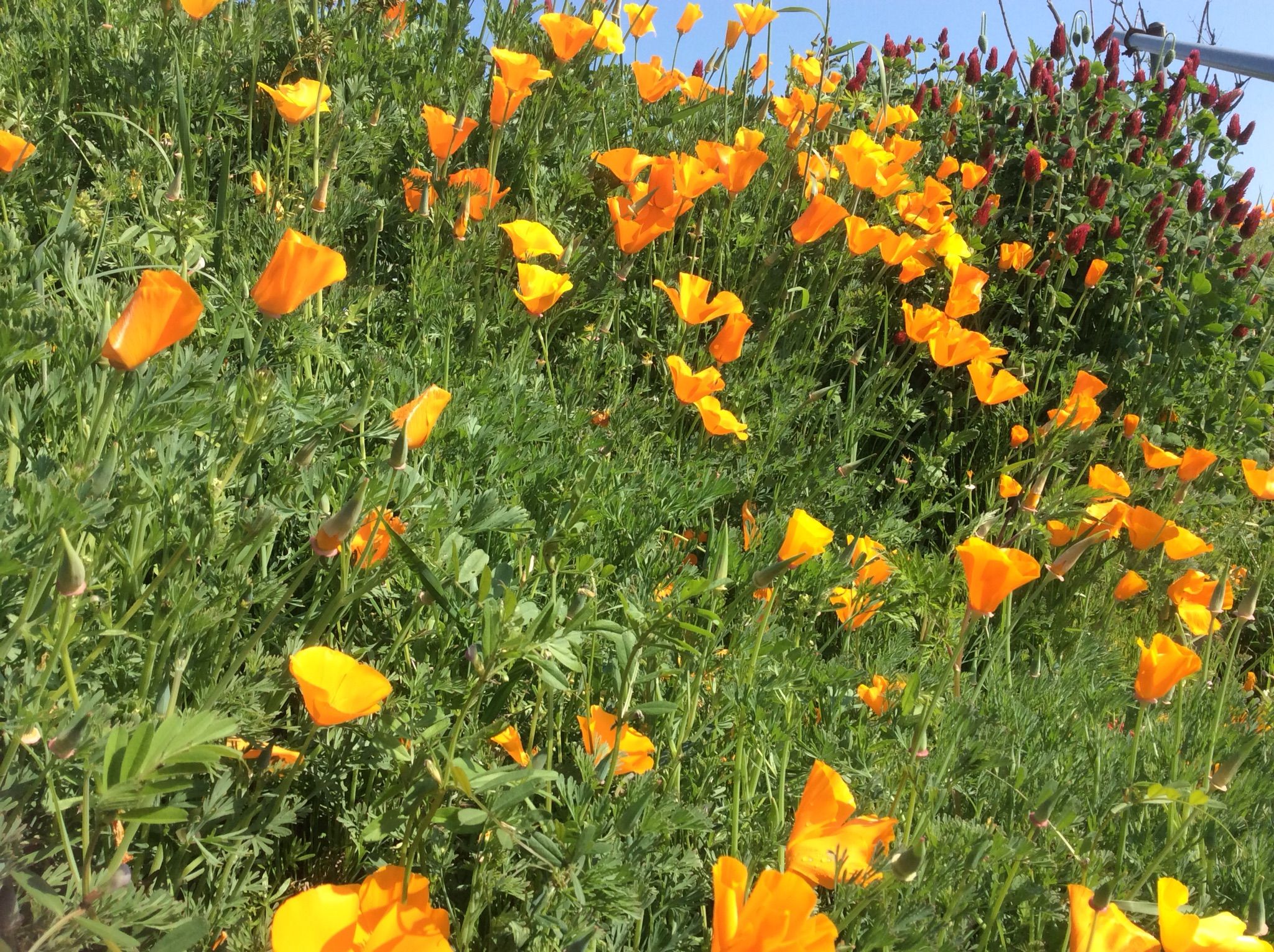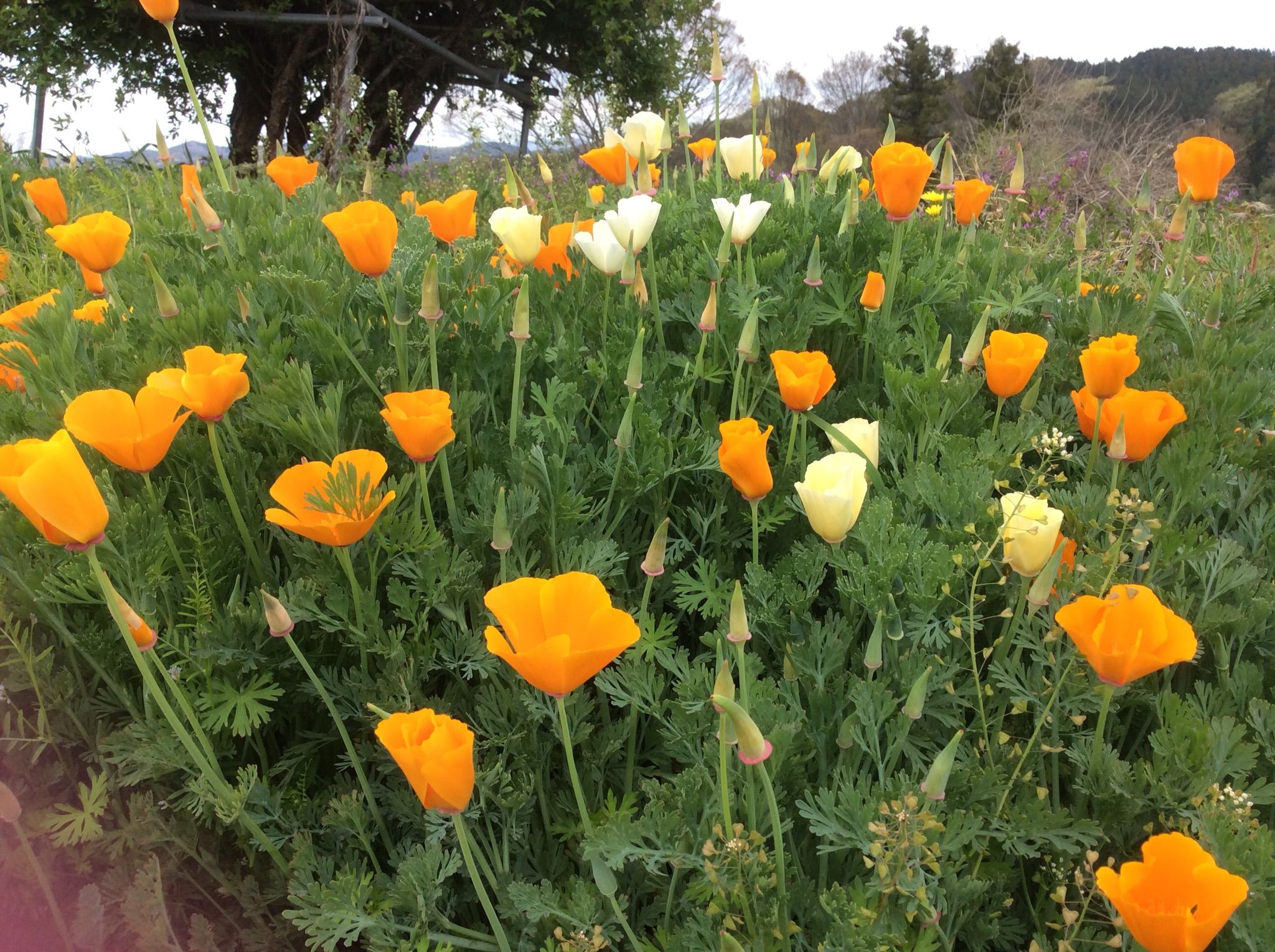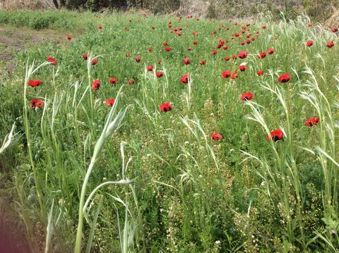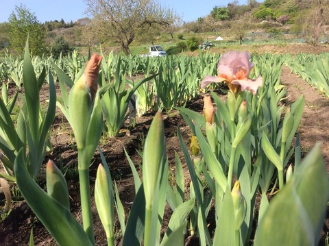 アイリスもつぼみも葉の上に出てきました、花菱草も咲いてよいよ花々の競演が始まります。