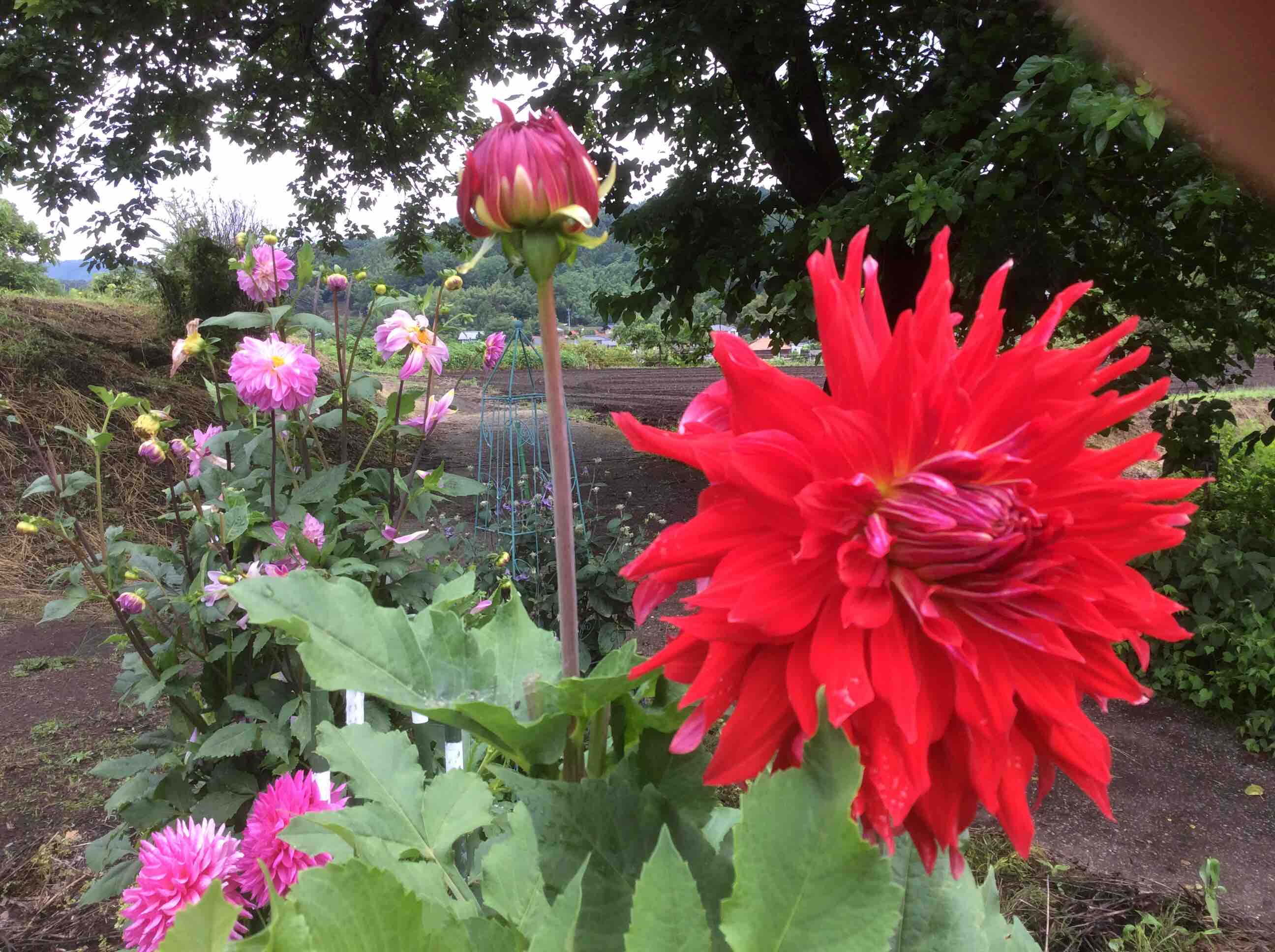 ヘメロカリス、3分咲き、ダリアは4分咲きです。