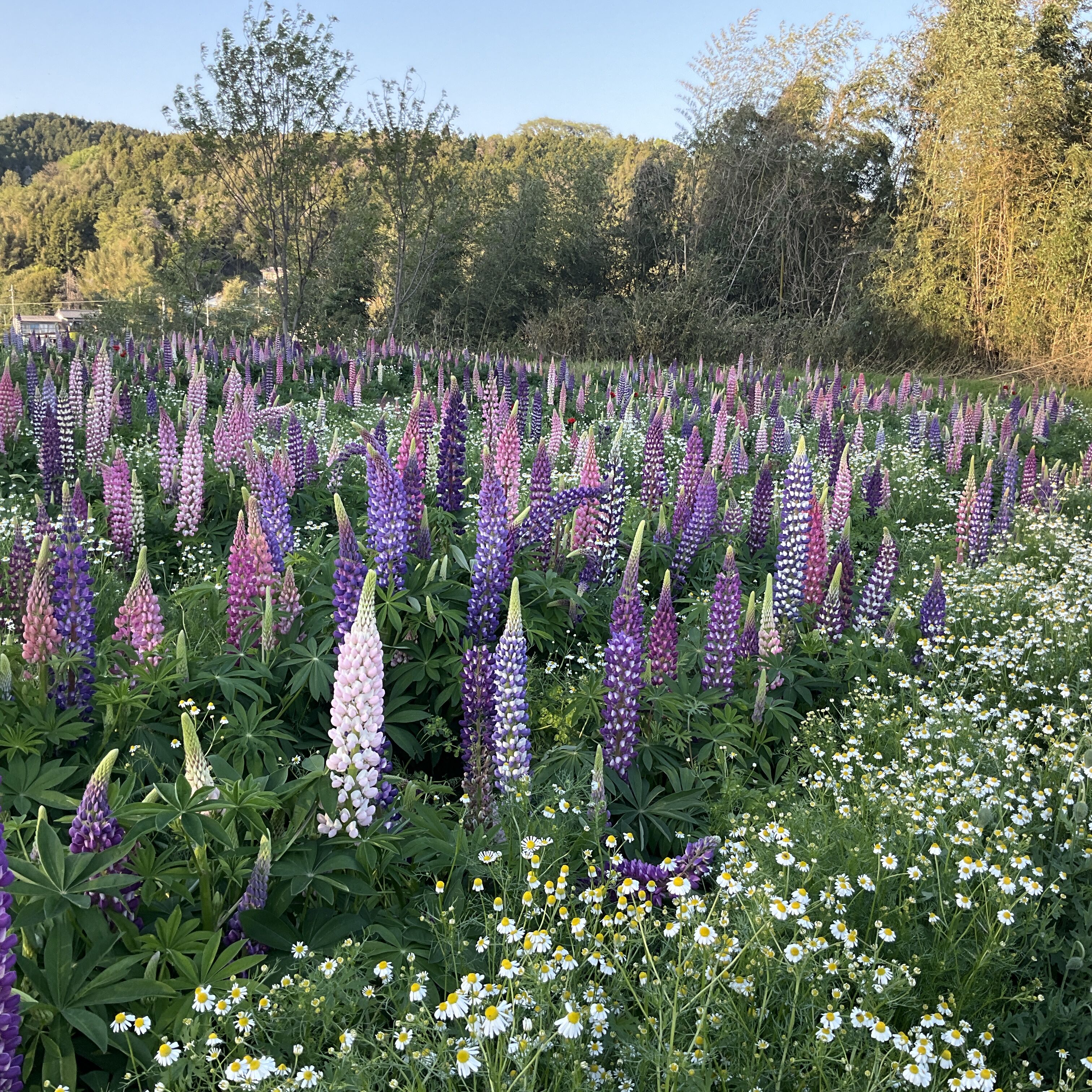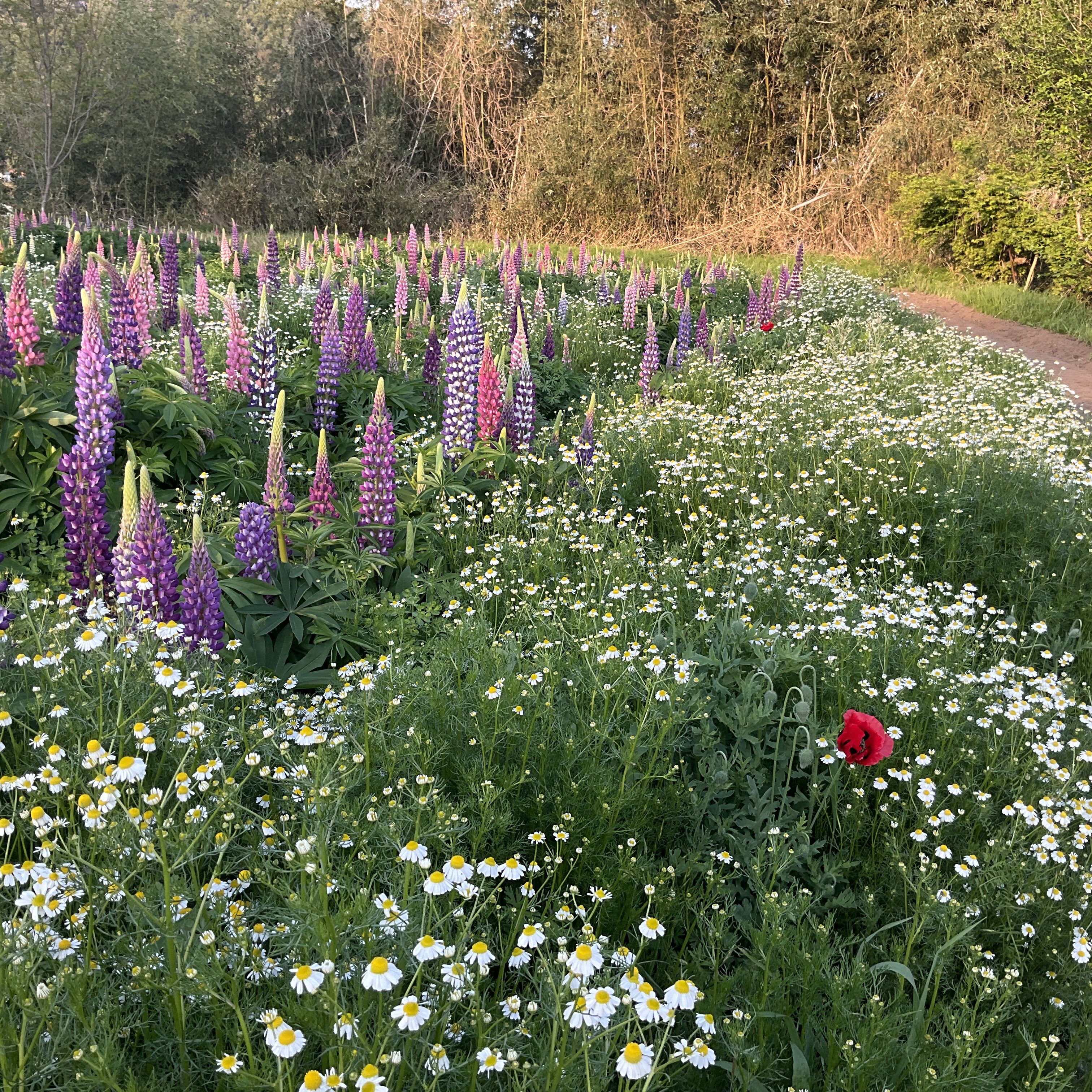 カモミールルピナスきれいにコラボしてます。アイリスの蕾も多く多く見えてきました。。
