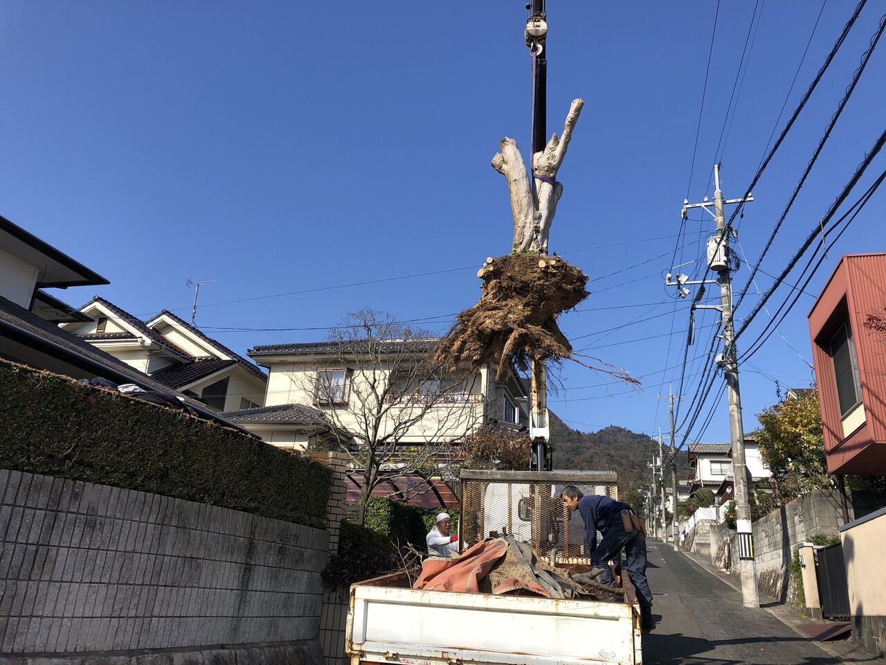 好天の中 安佐南区高取北 Y様邸の紅葉抜き取り施工をさせて頂きました。数十年、お庭を彩った紅葉
