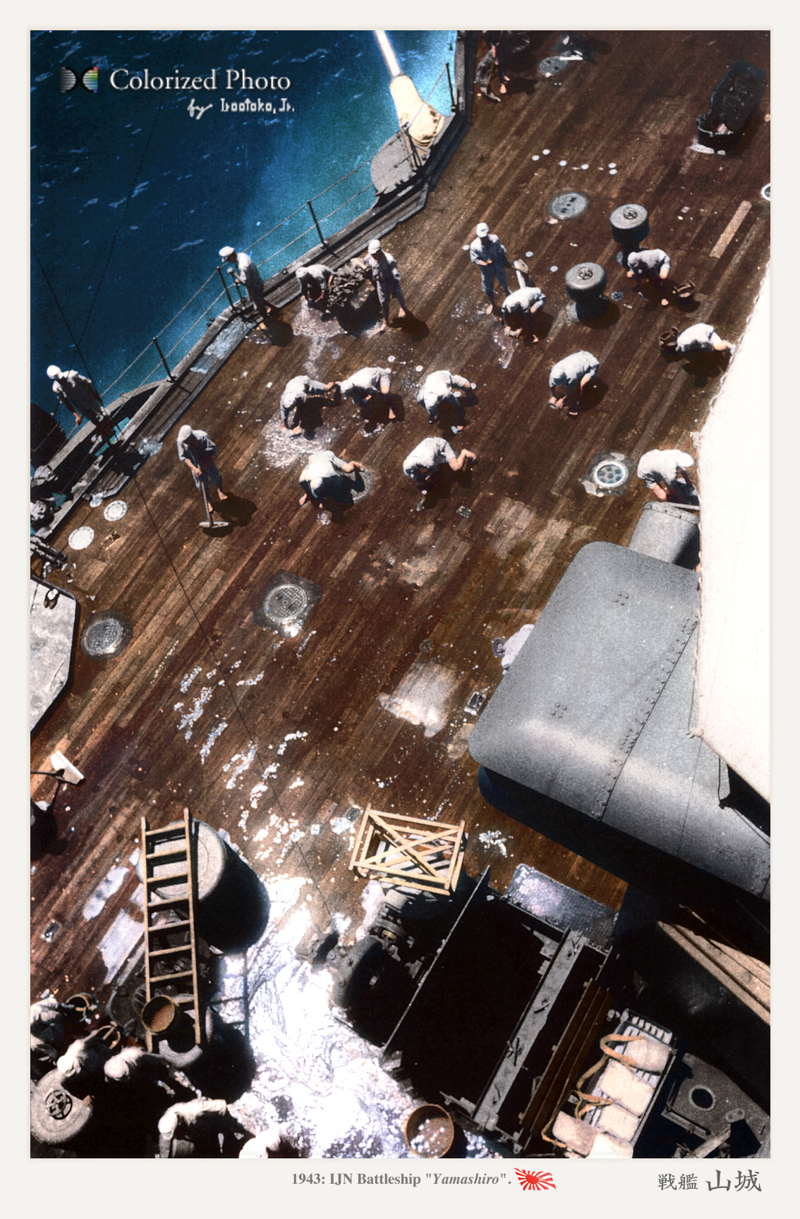 戦艦『山城』甲板清掃中 3番主砲右舷側最上甲板
