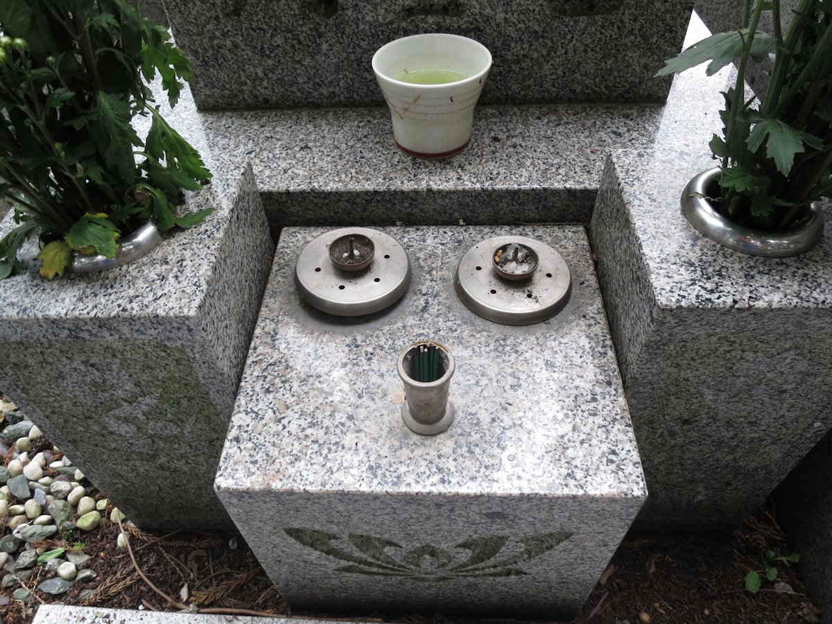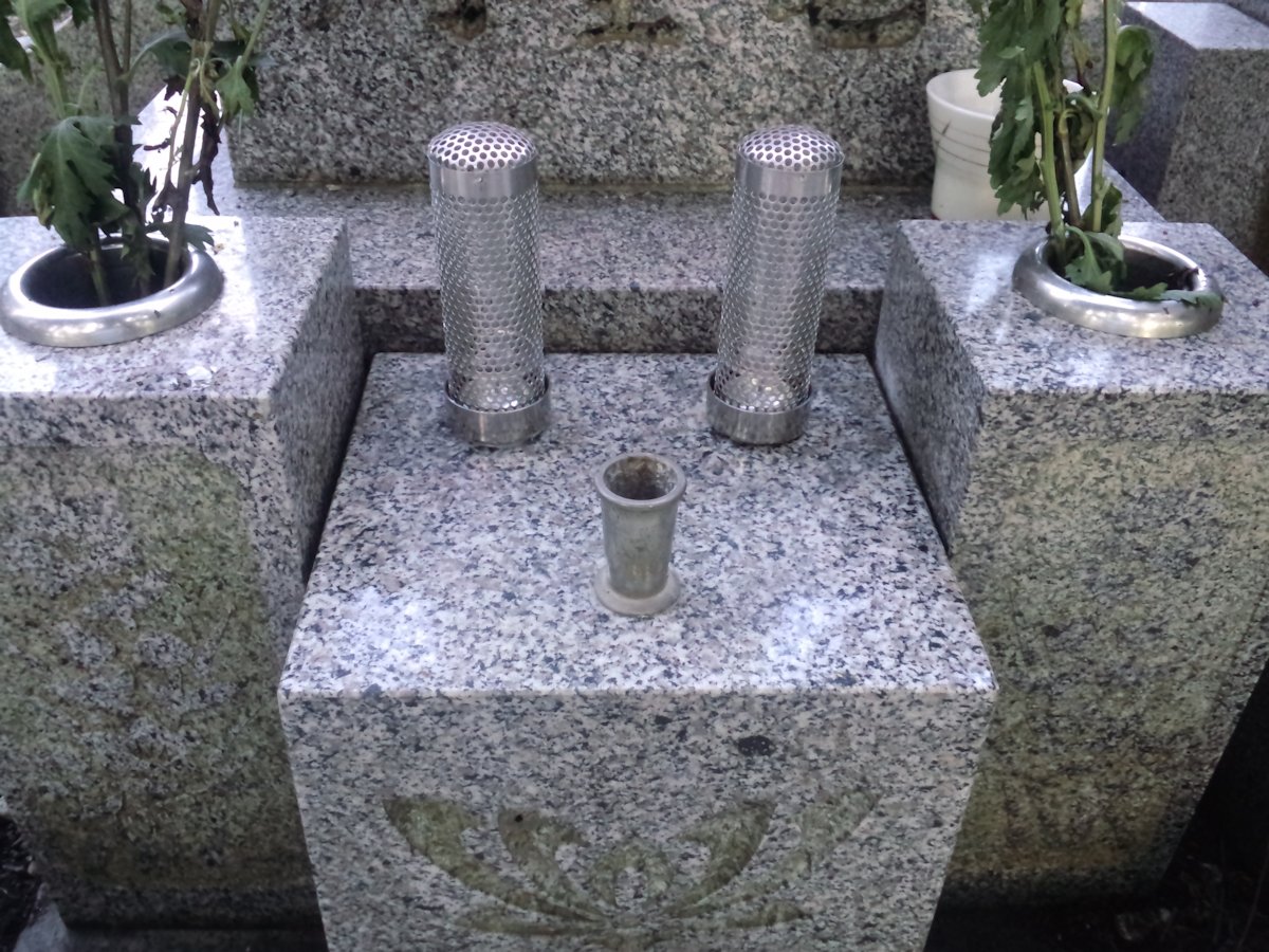 このごろは風よけのカバーがついたロウソク立が基本なのですが、古いお墓だとカバーがついていなかったり、カバーが壊れてしまってたりします。