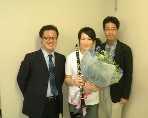 写真は、2006年5月28日の初演後、秋田県の湯沢市文化会館で。独奏Tromboneを演奏してくれた(2007年1月よりNHK交響楽団首席奏者を務める)新田幹男君と、2楽章で素敵なClarinetのソロを聴かせてくれた秋田県立湯沢高校吹奏楽部の白石さん。そしてちょっぴり笑顔の私です。
