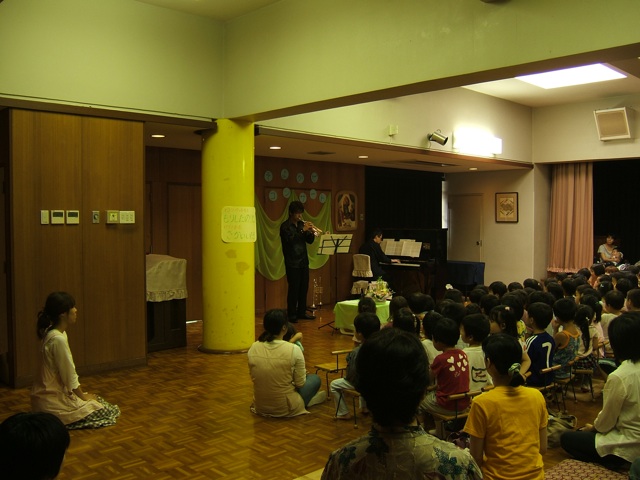 7月12日は、私がパートタイムでお世話になっている、そよかぜ幼稚園でのコンサート。2年前に、クラリネット。昨年は打楽器の友人に出演してもらいましたが、今年はトランペットの友人、森下智稔さんに来て頂きました。前回の記事で紹介した「湖の畔で」のジャケ写を撮ってくれた友人です。