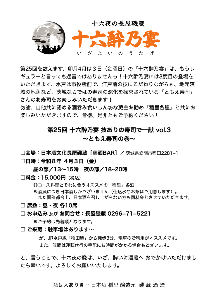 さて、第25回を数えます卯月4月3日(金曜日)の十六夜は、皆さんの熱いラブコールにお応えすべく、茨城ならではの寿司を探求されている、あの「ともえ寿司」が、3度目の登場と相成りましたっ!