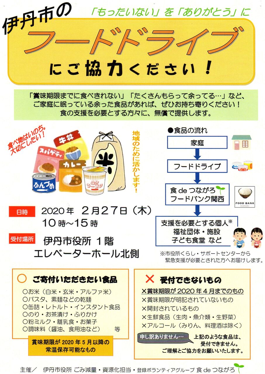 ボランティア・市民活動センター登録ボランティアグループ「食deつながろ」さんより、「フードドライブ」のご案内を頂きました!