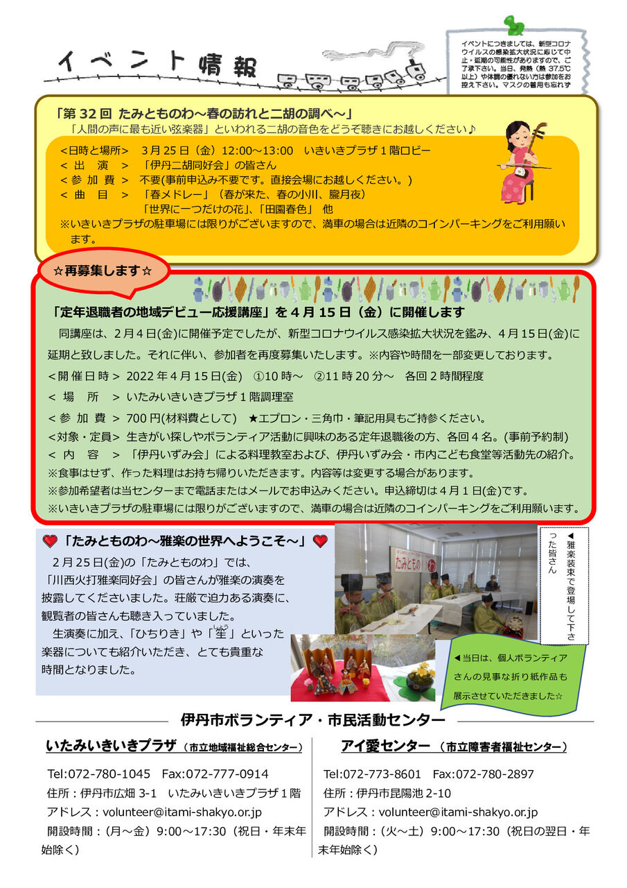 センターが主催する教室、講座、イベント等の事業について、中止や延期、実施