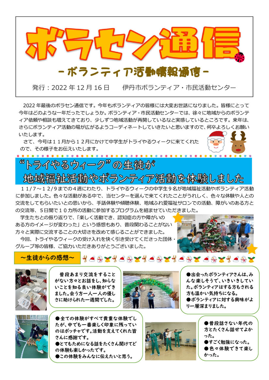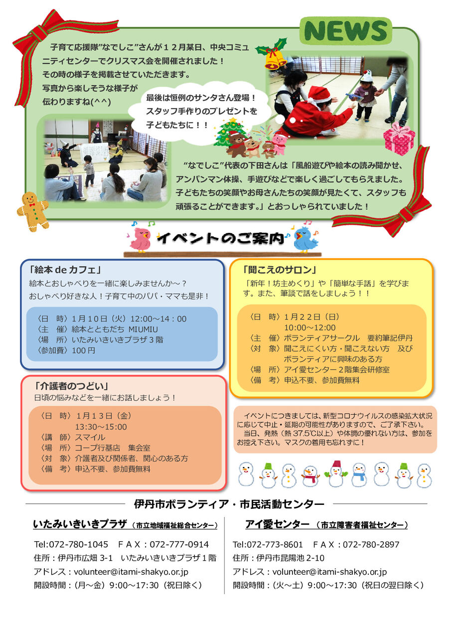 場 所 : 阪急伊丹駅周辺歳末たすけあい運動は、地域の誰もが安心して、あたたかいお正月を迎えることができるよう、共同募金運動の一環として、地域住民やボランティア・NPO団体など協力のもと、地域のさまざまな福祉活動を実施しています。