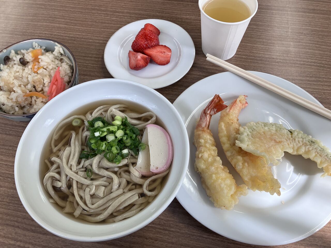 本日の献立は、*かけそば *海老天 *炊き込みご飯 でした。