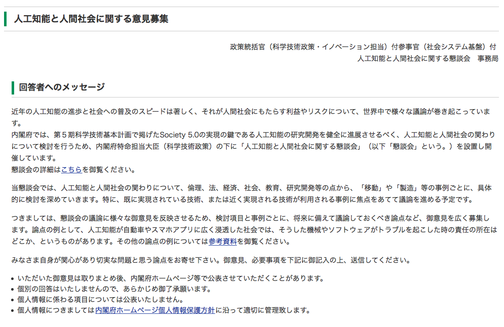 人工知能と共存する社会のあり方を検討している内閣府の有識者懇談会は7日、今後の議論の参考にするために一般からの意見を募集するサイト(https://form.cao.go.jp/cstp/opinion-0198.html)を開設した。