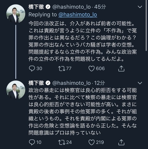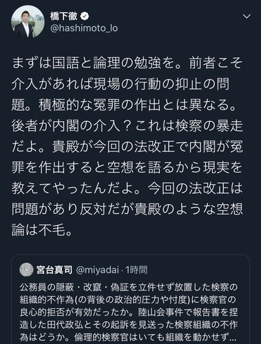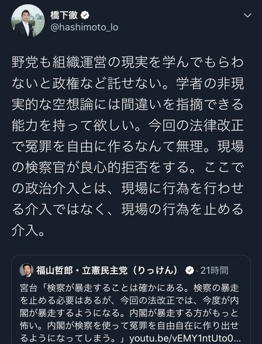 要するに橋下は、内閣が作為的な冤罪を作出するおそれがあるという主張は机上の空論で現場を知らない。現実は検察が良心から拒否する。