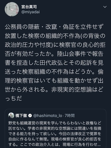宮台は、検察官の良心拒否が働くという主張こそ空想だし、作為と不作為はいずれも行為なんだから分けて作為には良心が働くって主張は意味不明という反論か。