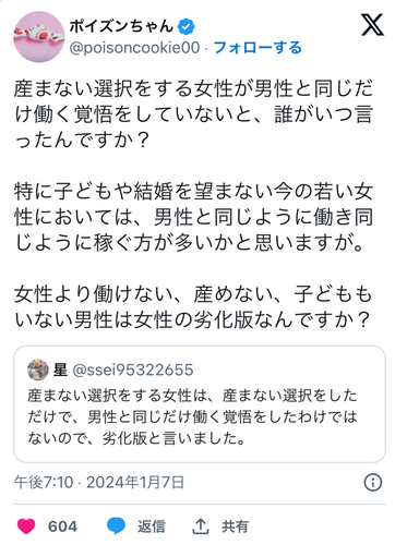 いやいや、産まないなら男同じ生産量で働けよ同じ人間だろ甘えんな