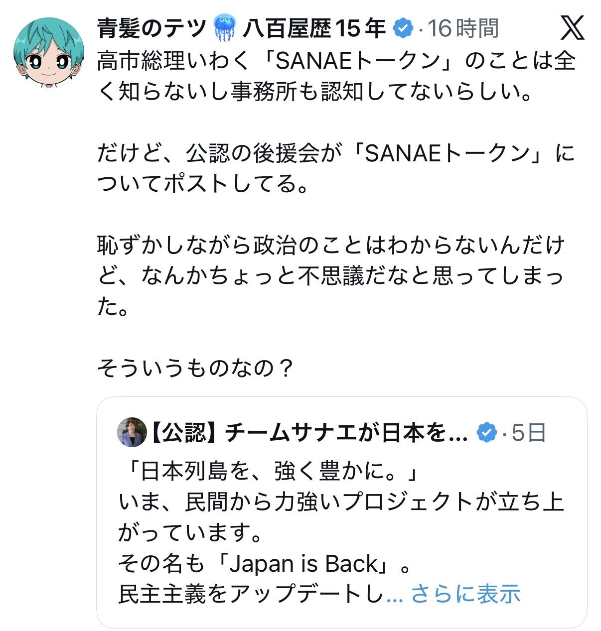 関連:【悲報】溝口さん率いるノーボーダー、高市早苗トークン(SANAE TOKEN)を発行してしまい、国を巻き込む大騒動に : IT速報