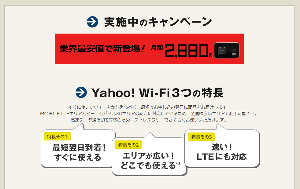 「Y! Fi(ワイファイ)2年間ずーっと得するキャンペーンプラン」は、Yahoo!プレミアム会員(月額399円)向けに提供されるプラン。利用料は当初の2年間が月額2880円、3年目以降は月額3880円。契約は2年契約。 2014年5月までは月間のデータ通信量に制限は無い。2014年5月以降は月間10GBを超えると通信速度が制限される。