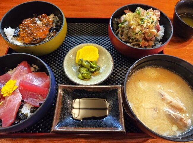 アジのミニたたき丼、ミニいくら丼、ミニマグロ丼、サラダ、あら汁付きです。
