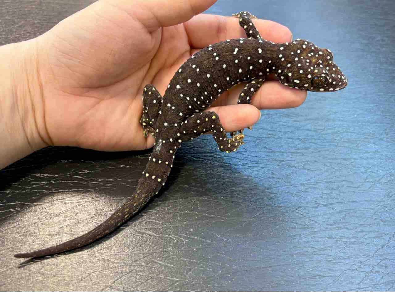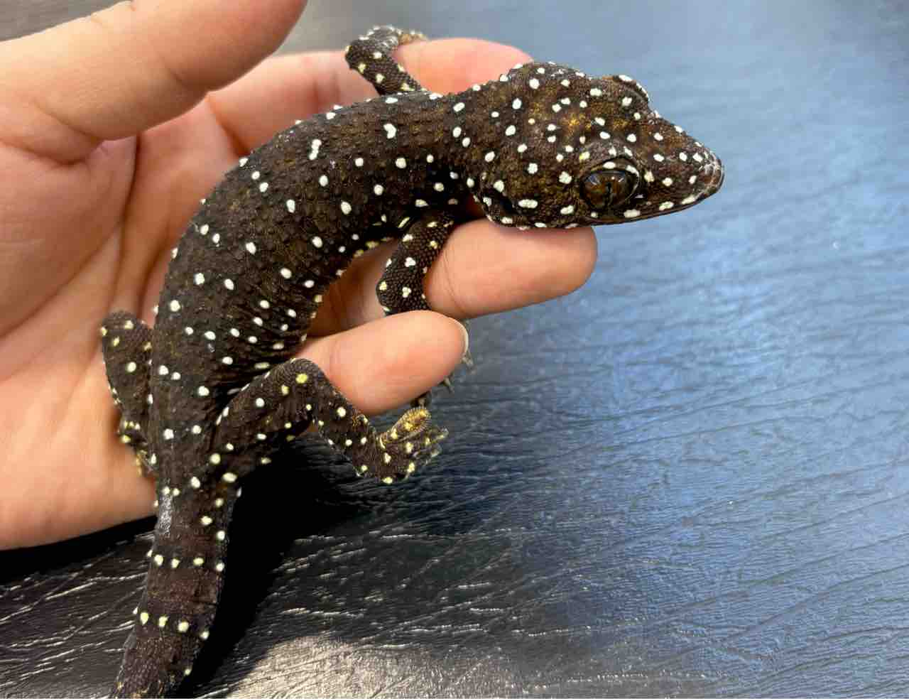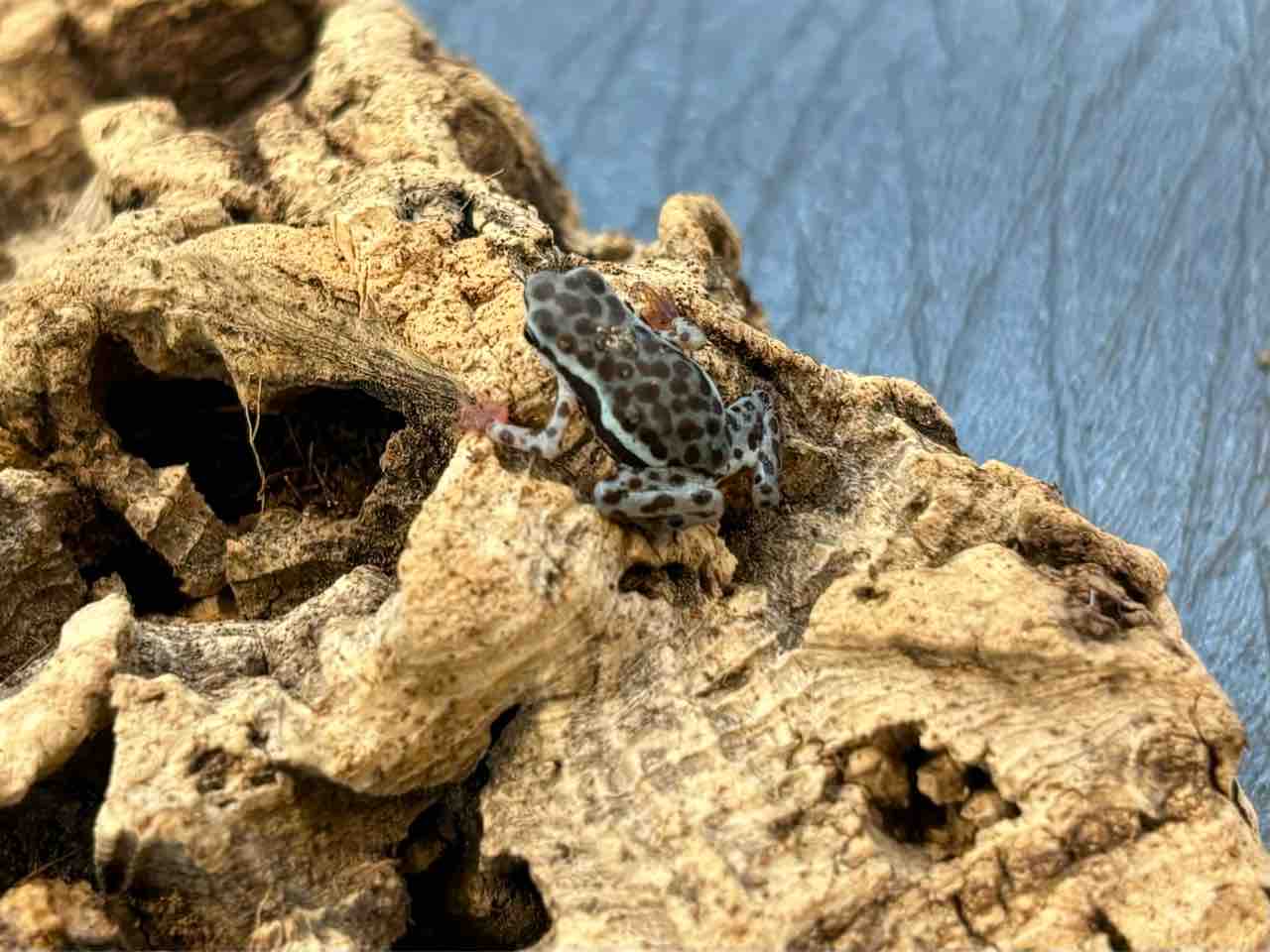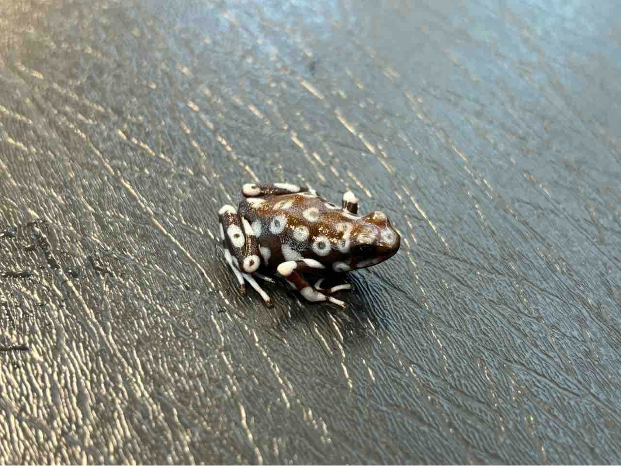 黒い体色に淡い水玉模様が特徴的なカエルですね