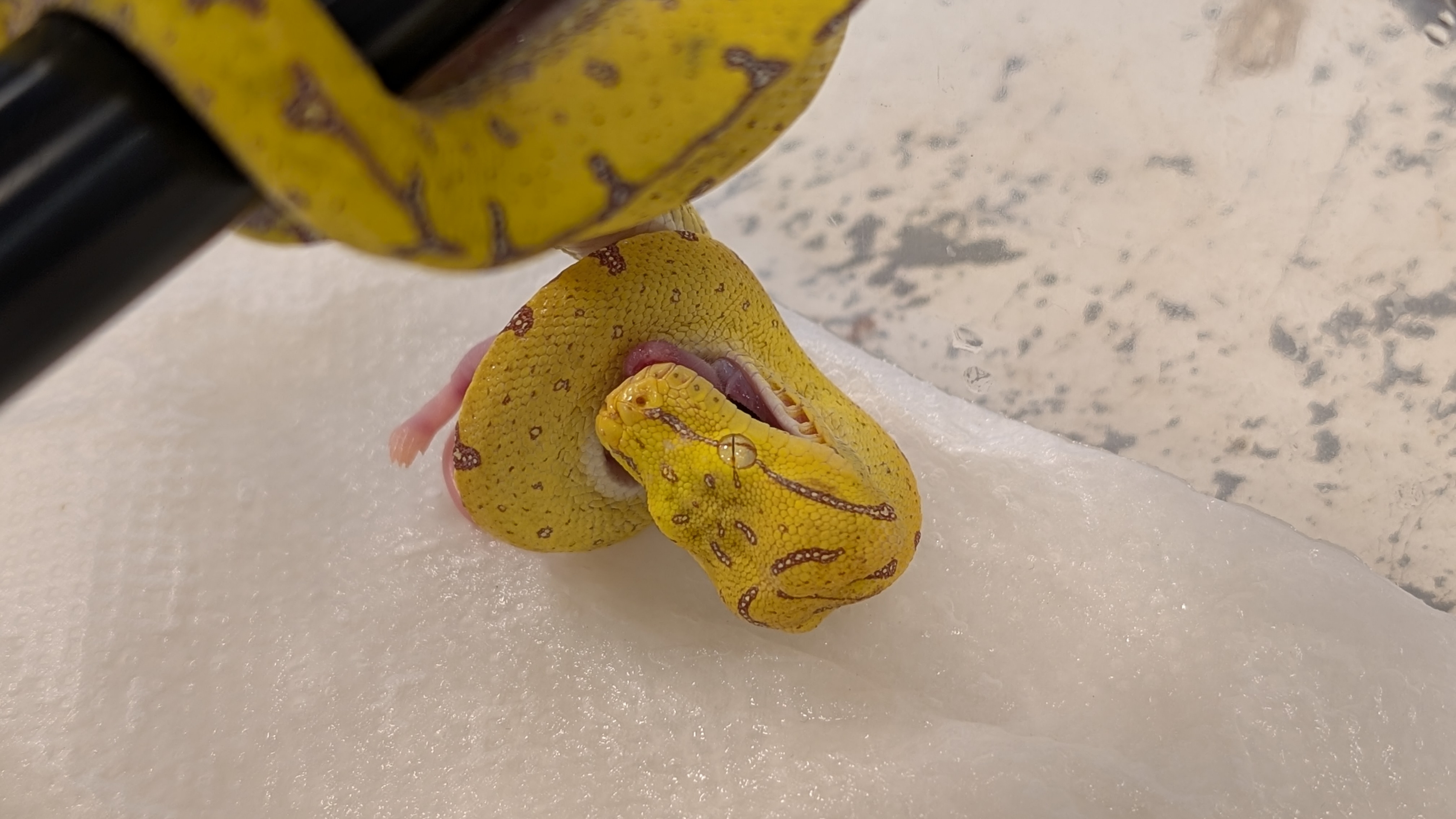 どの個体もしっかりとピンセットからマウスを食べています