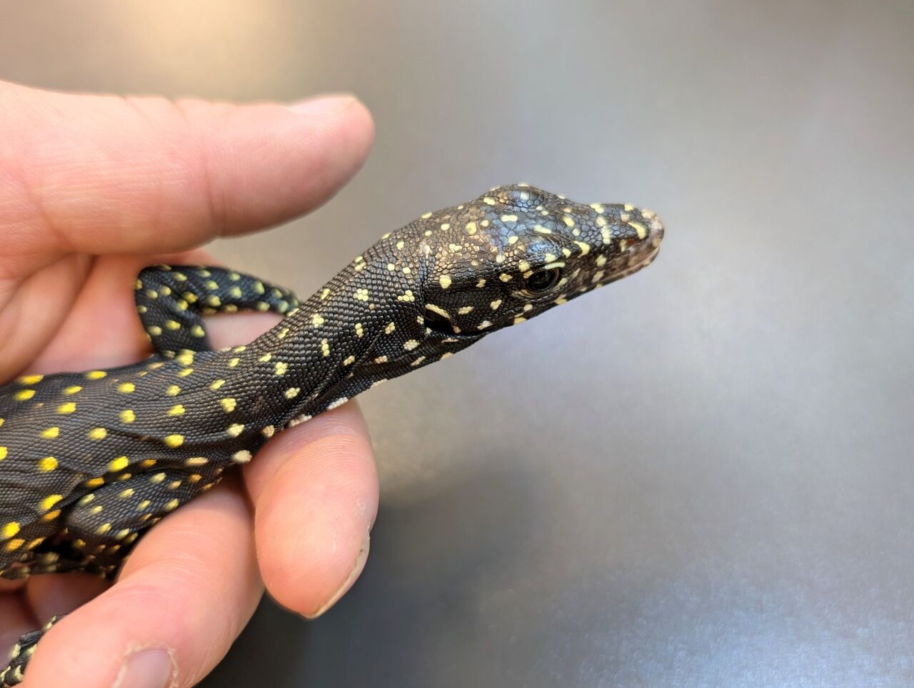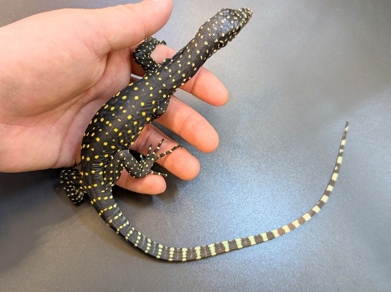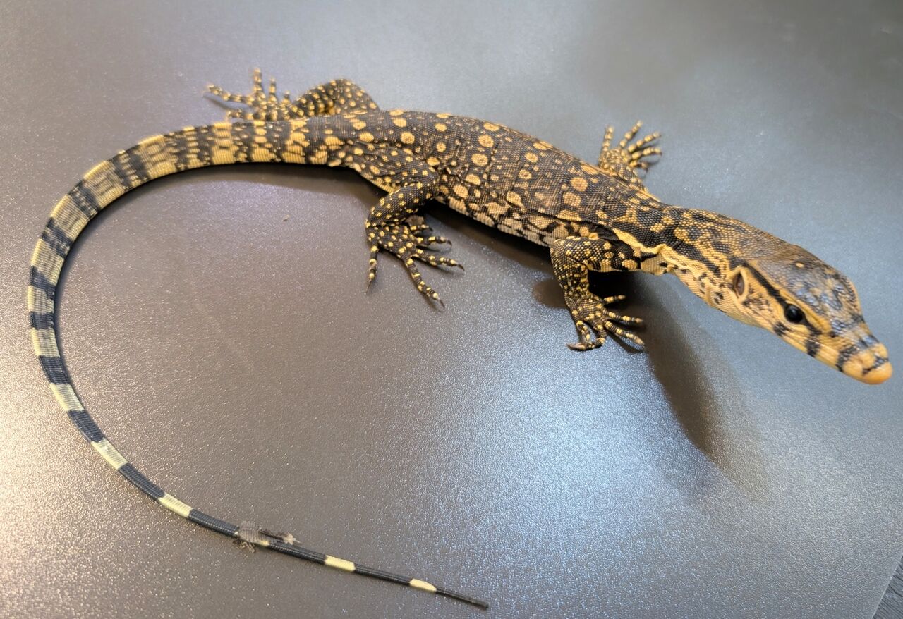 黒い体色に黄色のスポット、そして尻尾は鮮やかな水色と美しいモニター