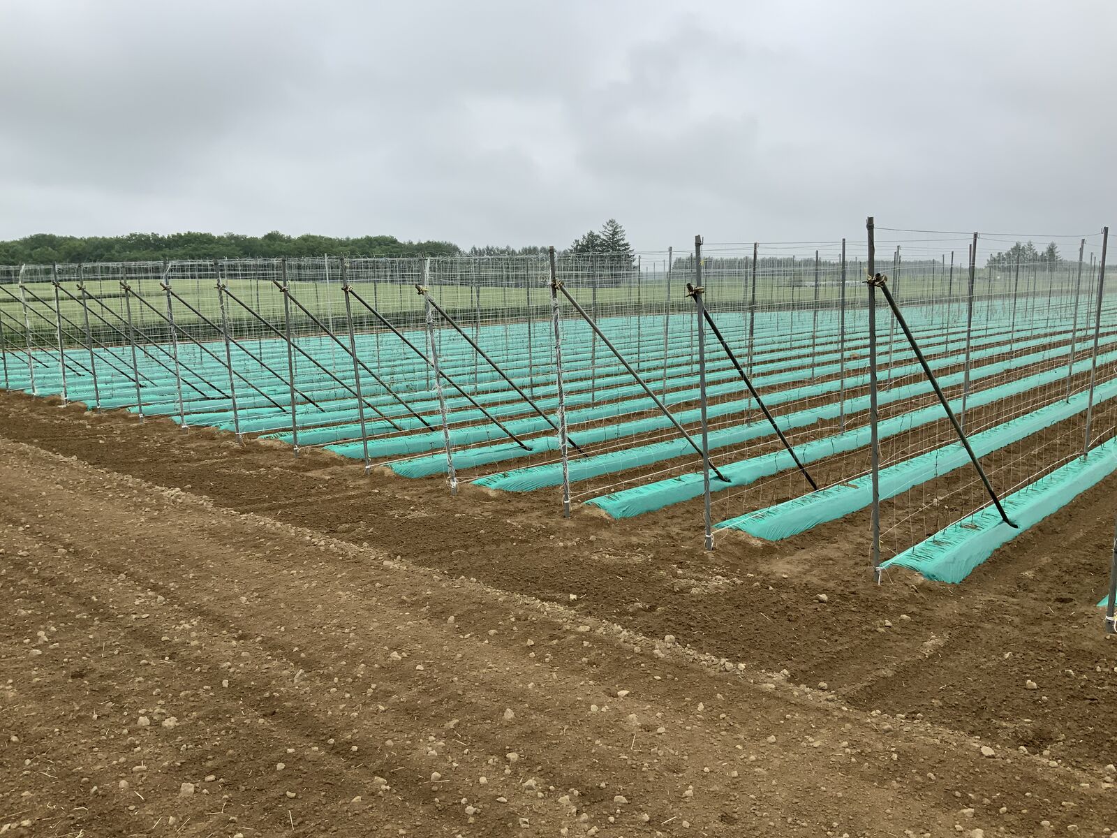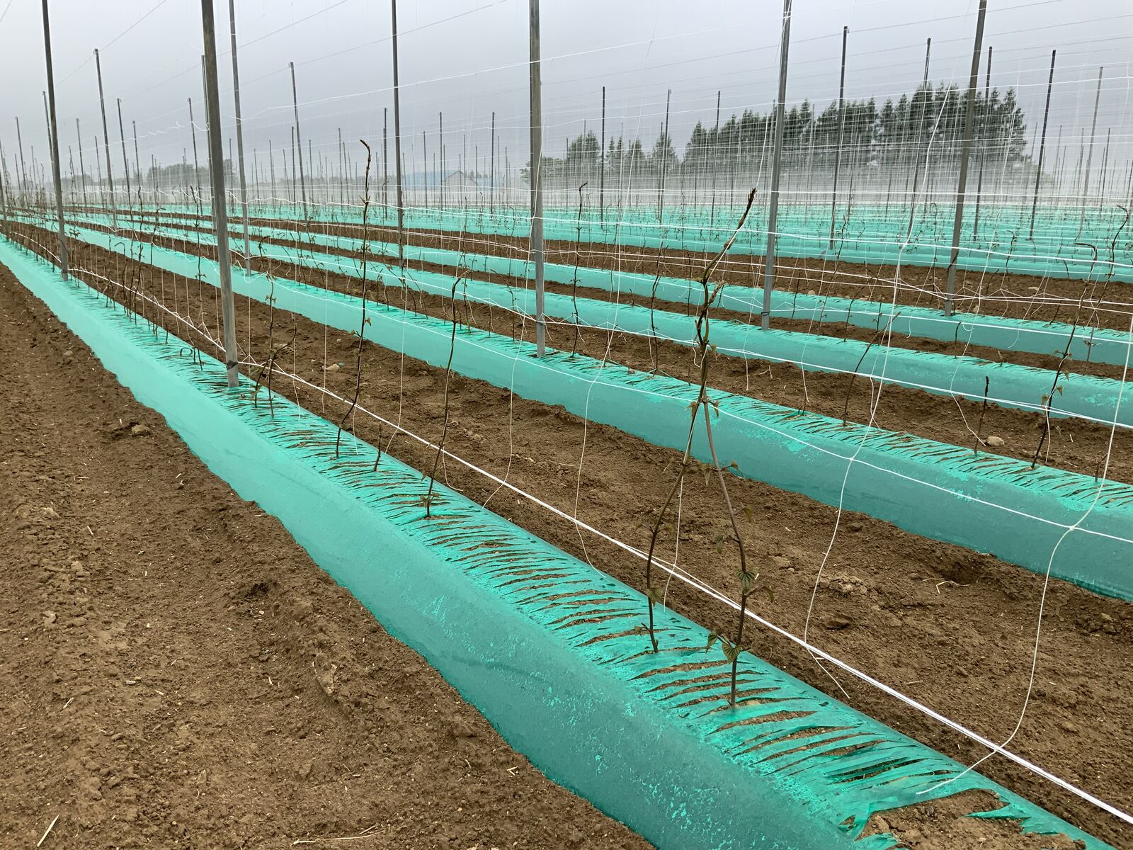 それから、長いもの畑に行くと、畦の上に一列ずつ張ったネットにつるがまきつき始めていたよ。