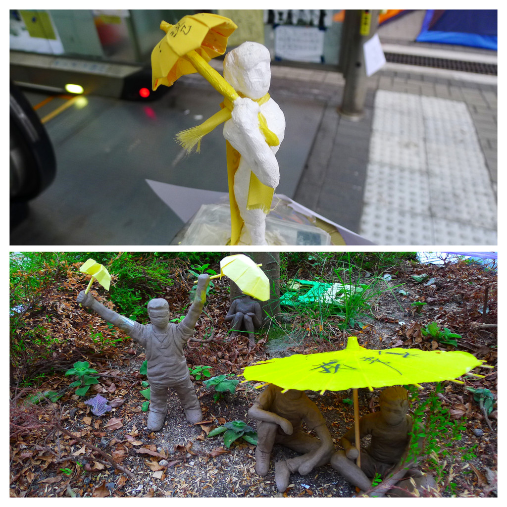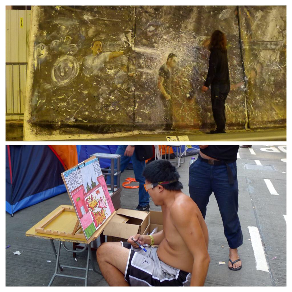 金鐘と旺角の占領区では大きく雰囲気が変わります。占領区内で黙々と雨傘革命を絵に描いていらした画家の方にも、その違いが現れていたような。なお、上が金鐘、下が旺角。