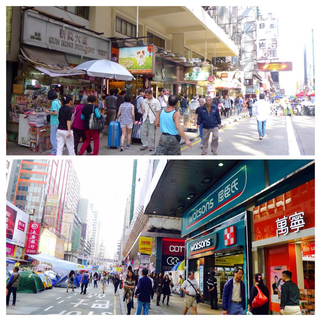 旺角アーガイルロード。同じストリートでも、バリケードの外側に出て占領区から少し離れると、すぐ普通の光景に戻ります。