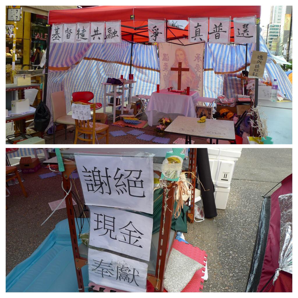 旺角占領区、クリスチャンに作られた手作り礼拝堂。「献金は固くお断りします」と貼り紙。雨傘革命占領区現場では救援物資は歓迎ですが、現金の寄付は受け取っていません。