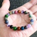 屋久島の自然を形にした屋久杉ブレスレット屋久島で見た自然の色を並べて再現した、屋久杉ブレスレットです。ソーダライト、ネフライト、ターコイズ、ケープアメジストなど、見たままの色を石で再現。不規則な並びながら、バランスのとれたデザインになりました。屋久杉が生