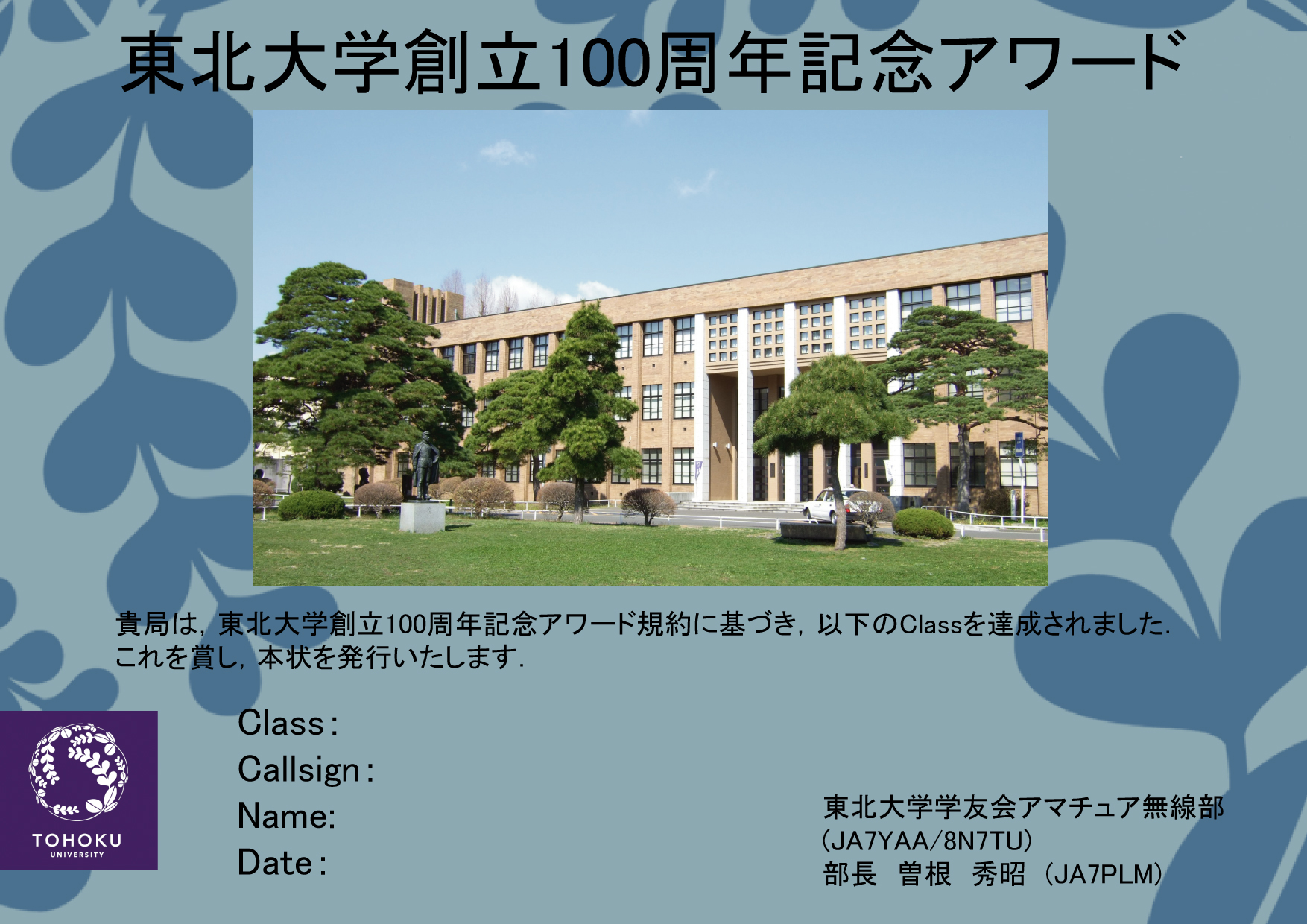 東北大学100周年記念局8N7TUの記事が先月号のCQ誌に載ったせいか?東北大学100周年記念アワードについて多くの問い合わせをいただいています.主は...インターネット見れないので紙のルールを送って欲しいというものですが...
