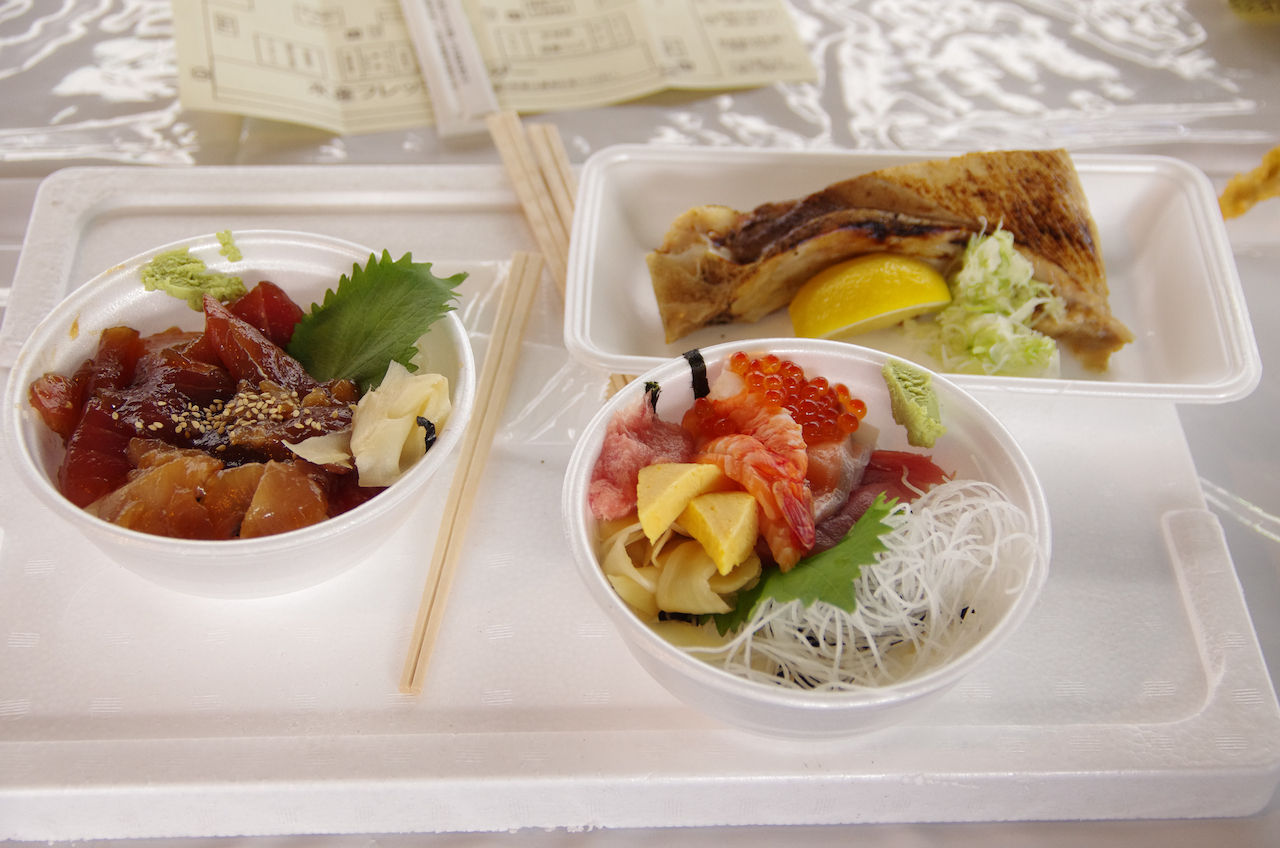 朝からマグロ漬け丼,海鮮丼,穴子丼をいただきました.みんなうまい!