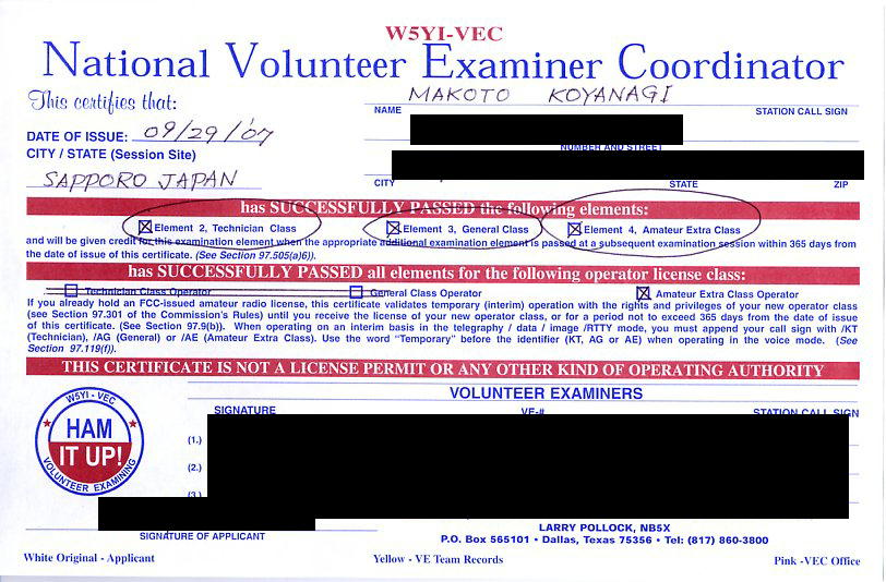 FCCの免許を取ってしまうと,W国内では,FCC免許が基準になるので,1アマでもTechnicianなら,意味無い.