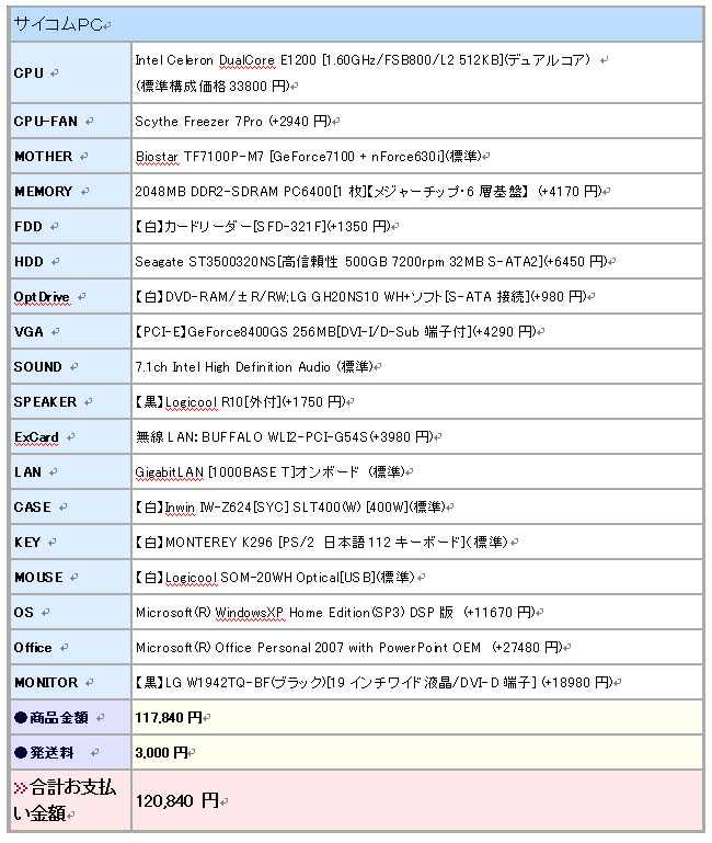 サイコムというPCショップを10年来使っていて、安くそれでいて実用的に組んでみました。そこに必要なソフトなどを組み合わせると・・・●パソコン 128400円
