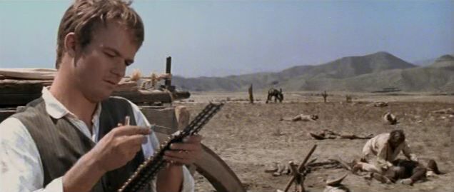▲仲間達が勝手に持って行った機関銃を取り戻しに来たエル・チュンチョ(G・M・ヴォロンテ)は、敵対政府軍と全面闘争になり、機関銃で皆殺しにしたが、味方の殆ども死んでしまった。