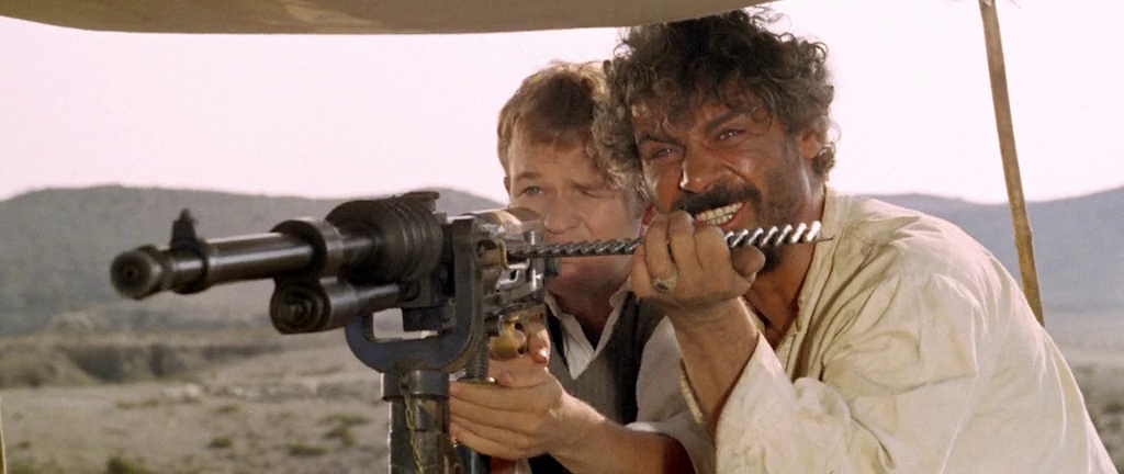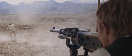 映画スタートから列車強盗団によって、メキシコ政府のお偉いさんが線路に張り付け状態で、最後には轢き殺される残酷あり(映像シーンは無し)、政府軍宿舎に安易な作戦で侵入して皆殺しの武器は窃盗と、無秩序で皆殺しの何でもアリの世界観に、トドメはマカロニウエスタン映画では御馴染の皆殺しには機関銃登場は当たり前!的に、大勢の敵なのか何なのかを撃ち殺しまくります。そんな、マンガのような主人公達の撃ちまくり、ダイナマイトで建物爆破・爆死しまくり、なシーンの連続に、ただただ御都合主義の大量殺戮と主人公は何故か奇跡のように死なない映画のラストに、取って付けたようなメキシコ人の哀しみを表現するようなシーンを展開されても、今の今まで好き勝手な内容だったから、何の共感も湧かず、ただただ違和感が残る、やはり終わり悪けり全て駄目のB級映画だったのでした。