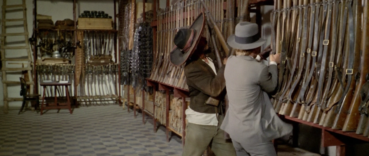 ▲ダイナマイト爆破と室内メキシコ兵を皆殺しした一行はライフル・銃器類を盗んで逃げちゃいます。