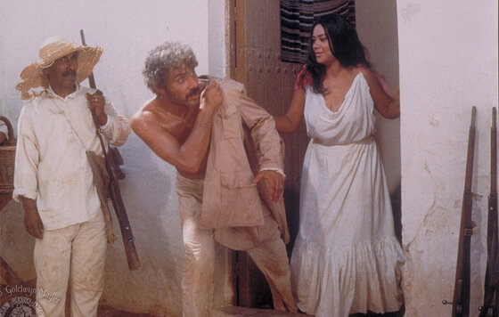 ▲白人地主の家に勝手に入り込むメキシコ市民とゲリラのアウトロー達に困惑顔の白人妻!