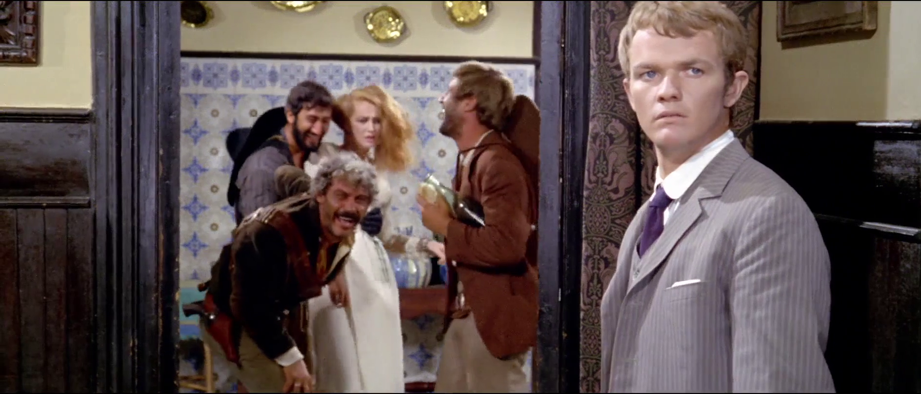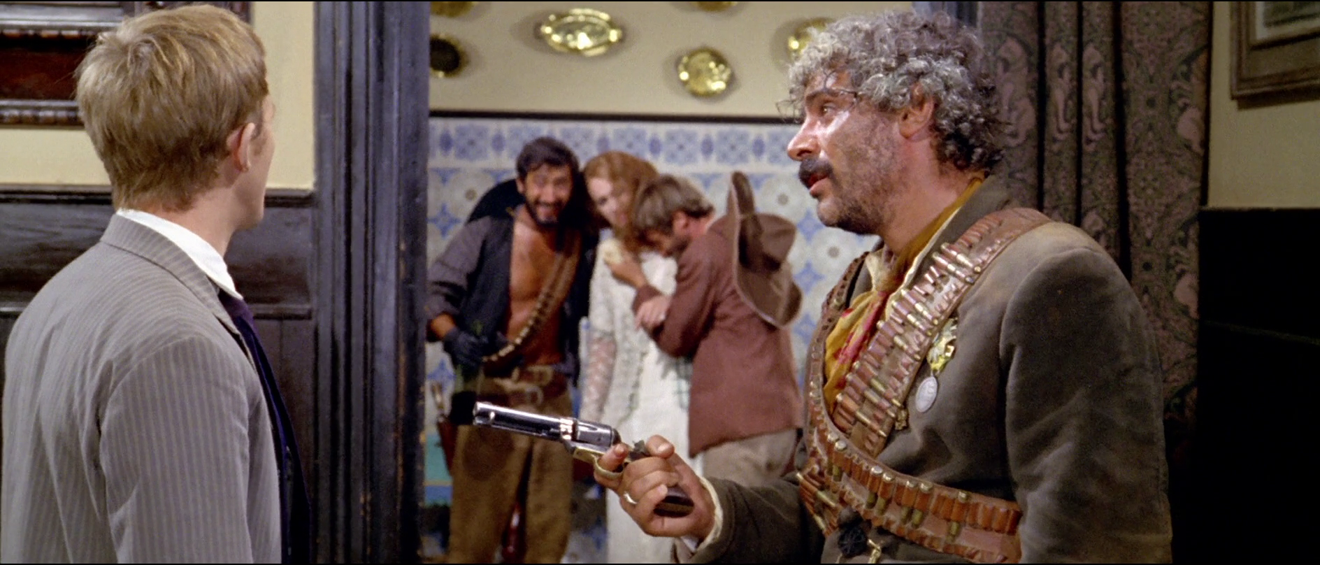▲地主は奥さんだけは助けてくれと願い出ているが、ゲリラの男どもは白人妻を玩具にし始めた。当然!仲間になった白人のルー・カステルは抗議するが、ゲリラ内紅一点のマルティーヌ・ベズウィックが「16才の時に金持ち白人にレイプされたことを告白され、同じ目に合わせて何が悪い」と反論されシーンとなる、のマカロニウエスタン映画にしては考え深いシーン!