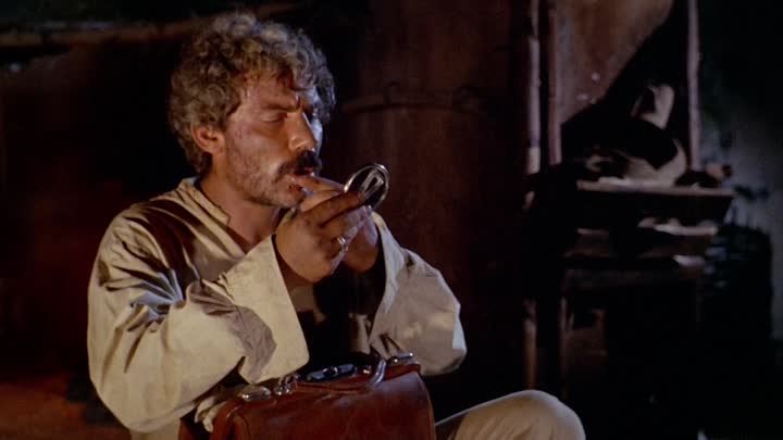 ▲荒野を移動中、ルー・カステルがマラリアに罹患しバックの中から薬を探す時に、何故か黄金のライフルの弾を見付けてしまうエル・チュンチョ(G・M・ヴォロンテ)。