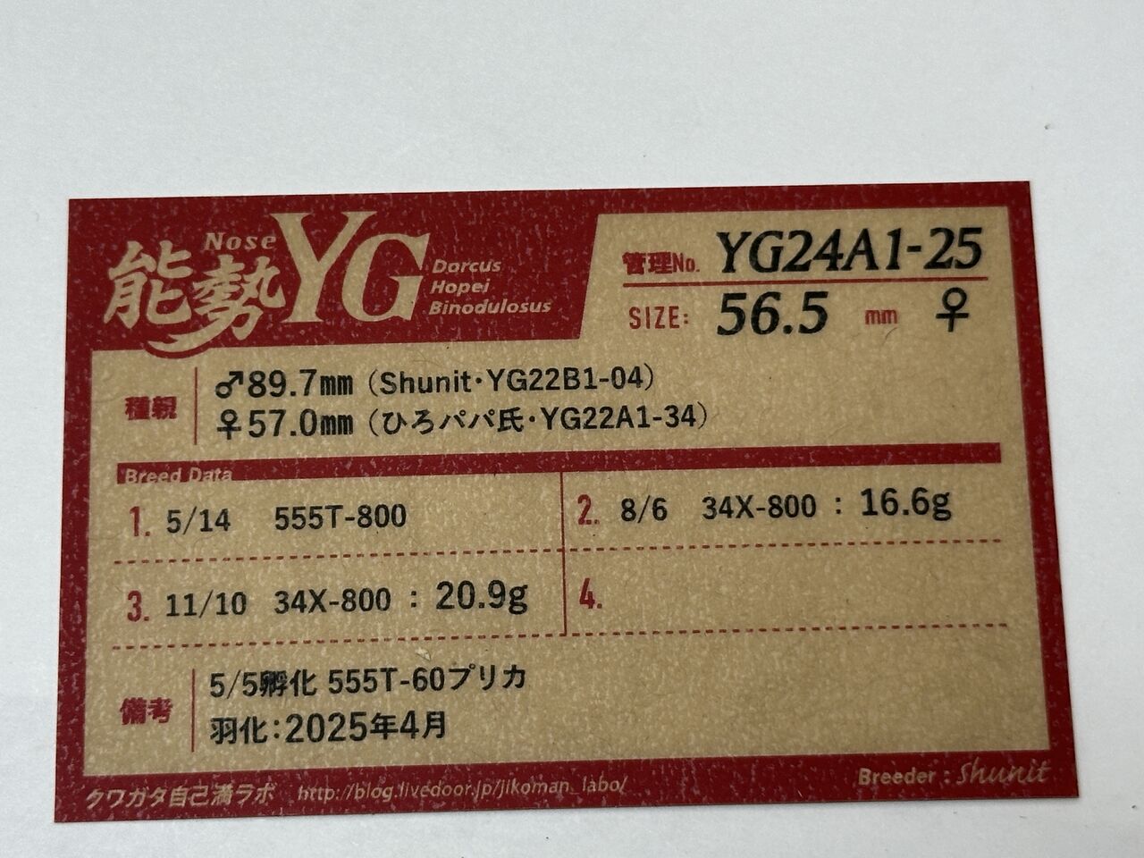 ♀54.5mm(YG24D1-01)2025年4月羽化、後食済み