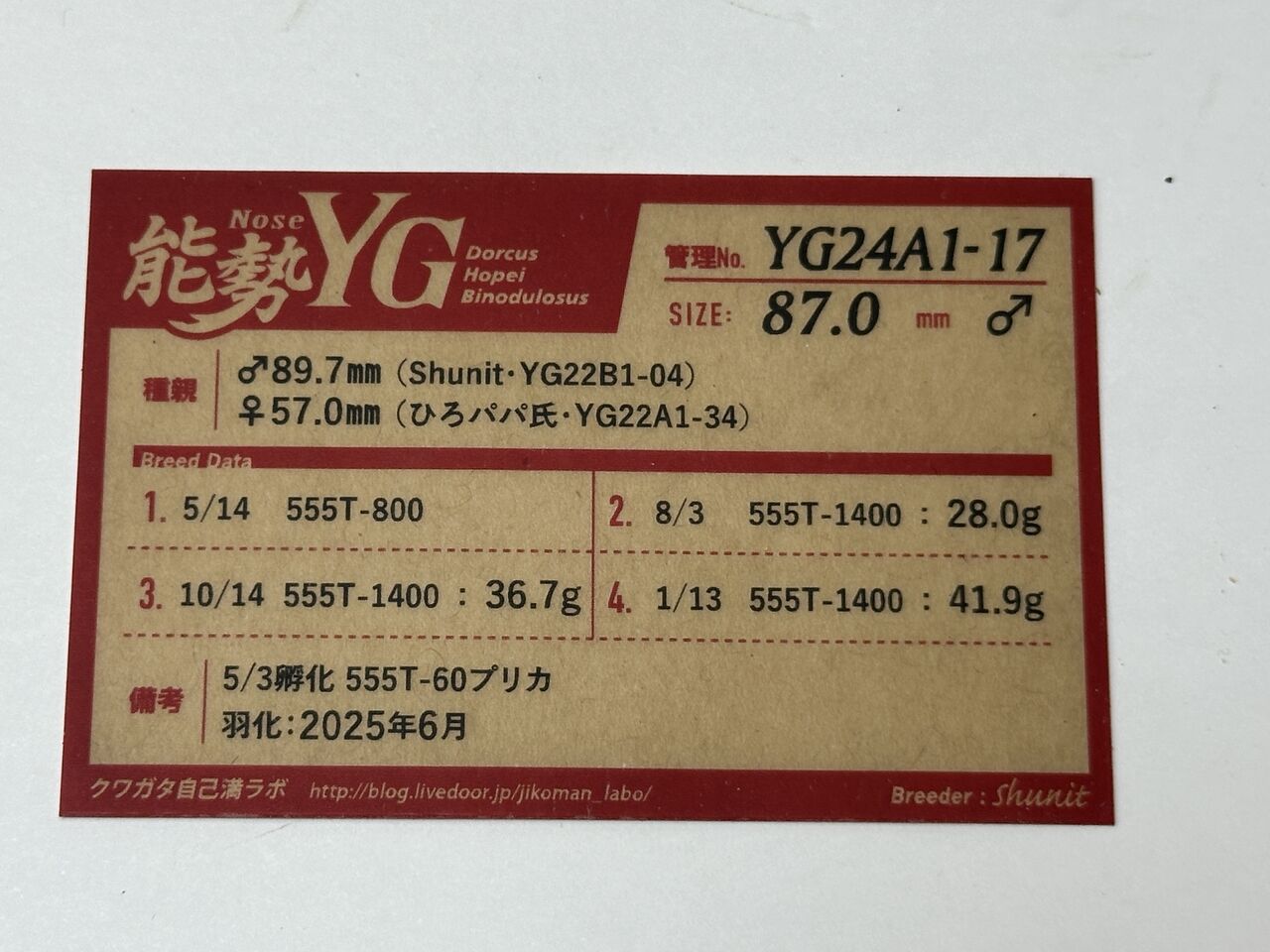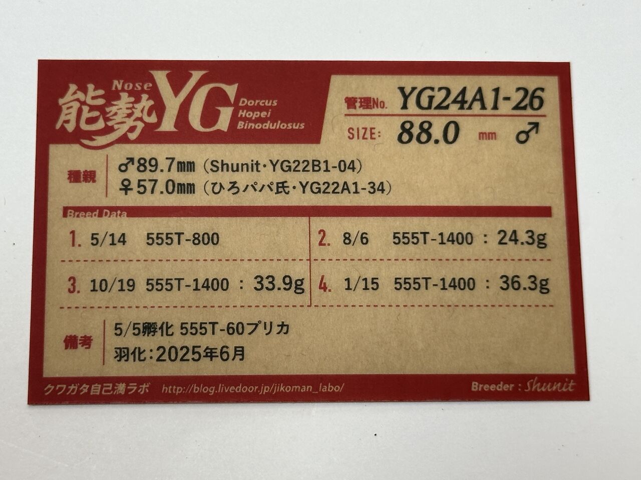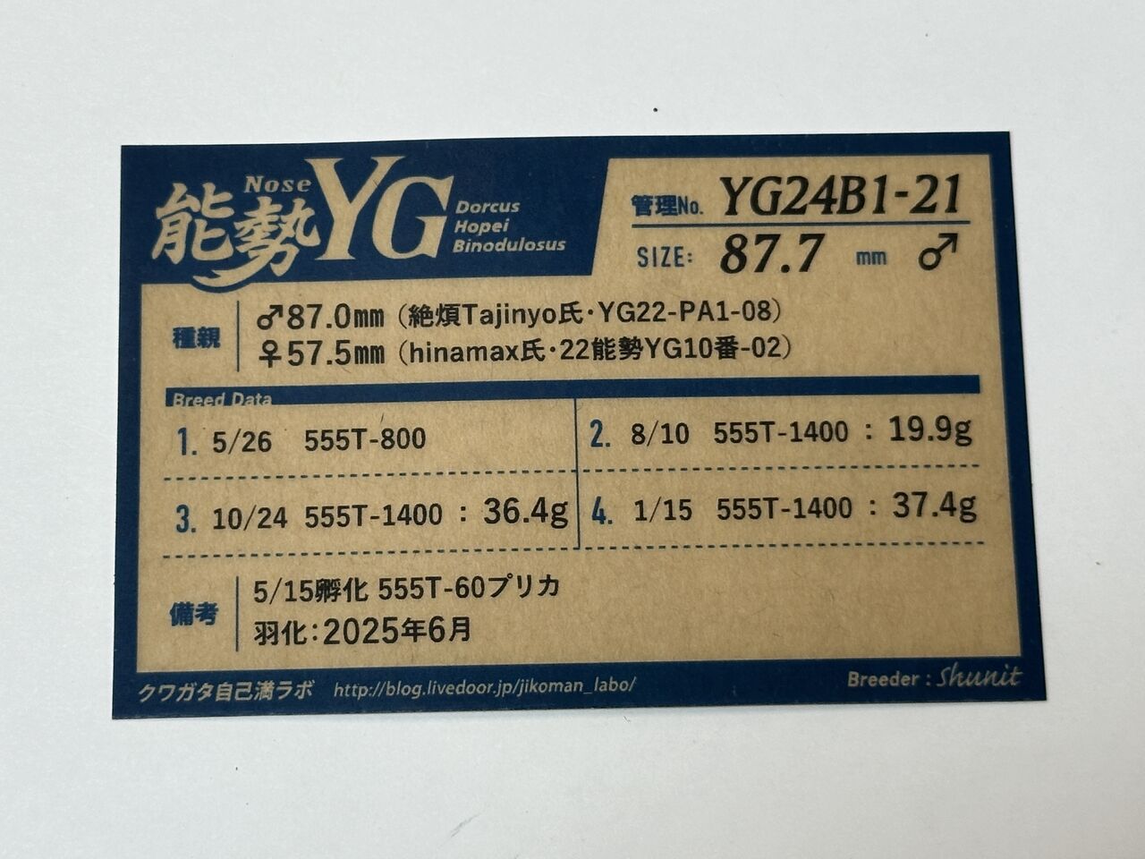 ♂87.7mm(YG24B1-21)2025年6月羽化、後食済み