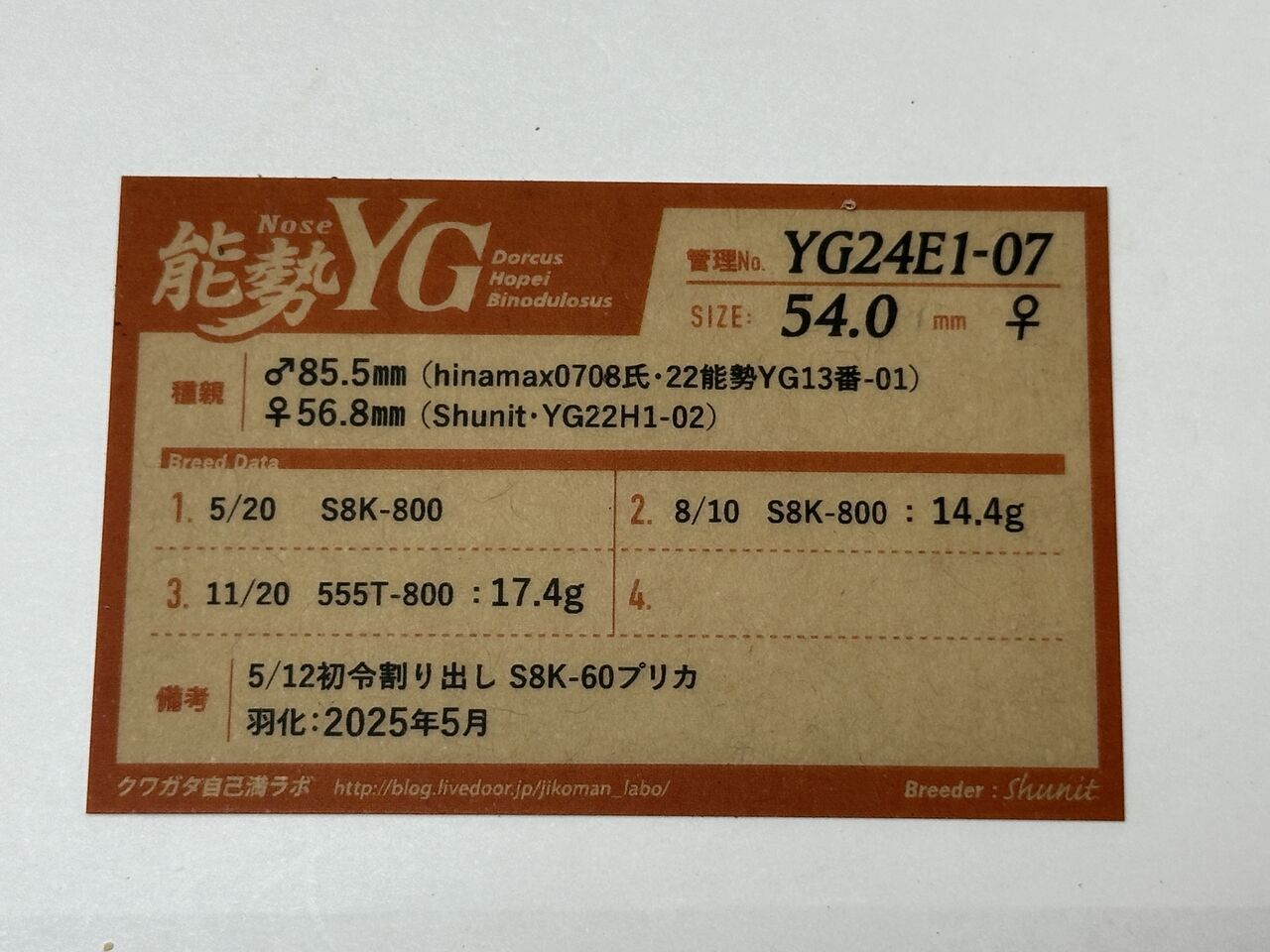 ♀54.0mm(YG24E1-07)2025年5月羽化、後食済み