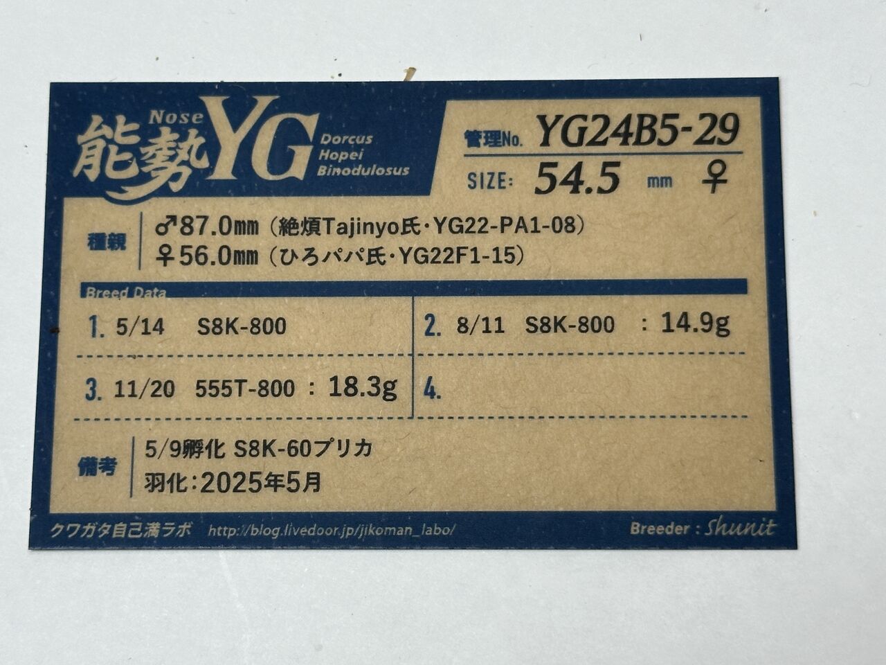 ♀54.5mm(YG24B5-29)2025年5月羽化、後食済み