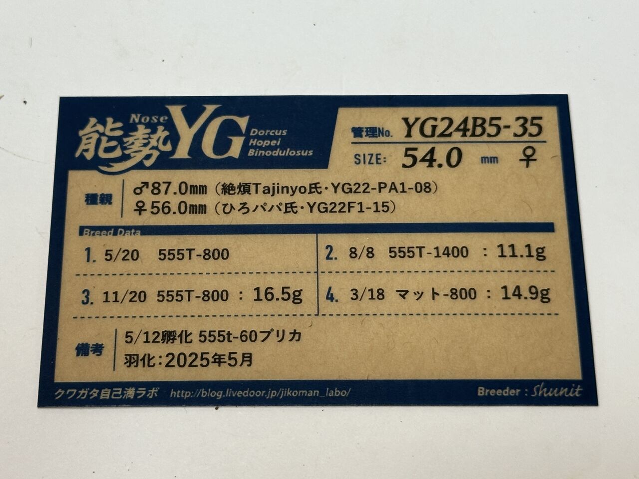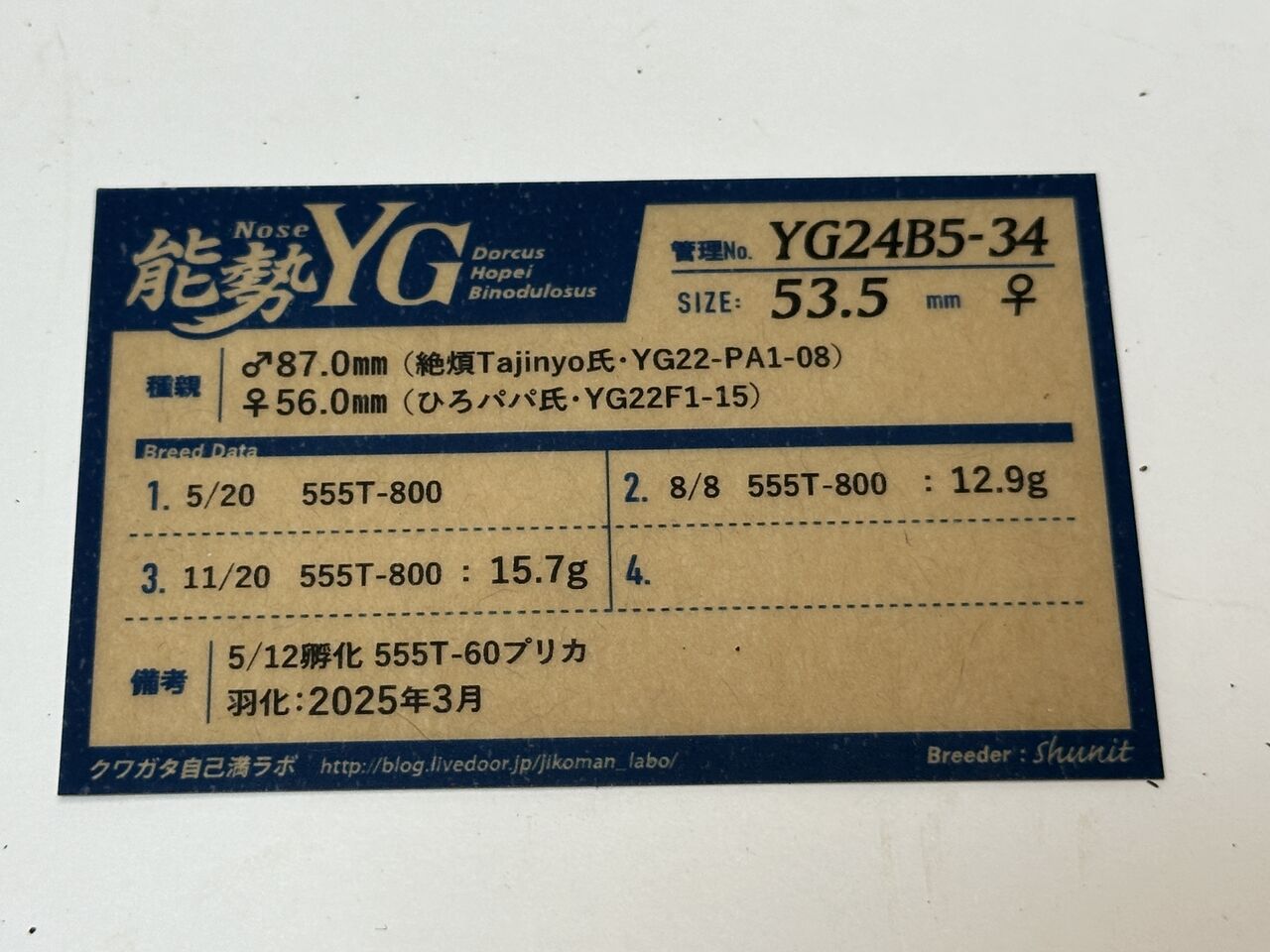 ♀53.5mm(YG24B5-34)2025年3月羽化、後食済み