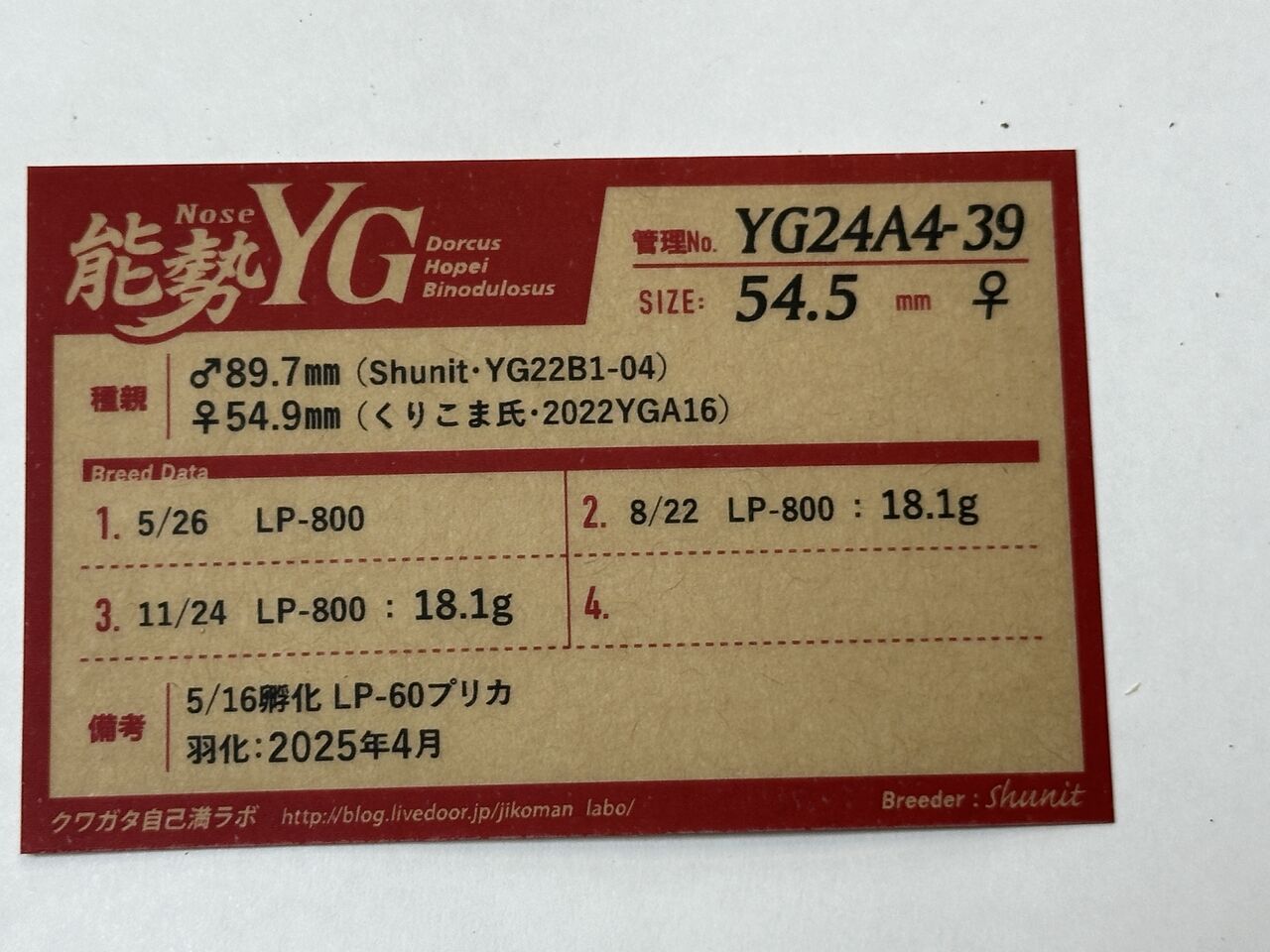♀54.5mm(YG24A4-39)2025年4月羽化、後食済み