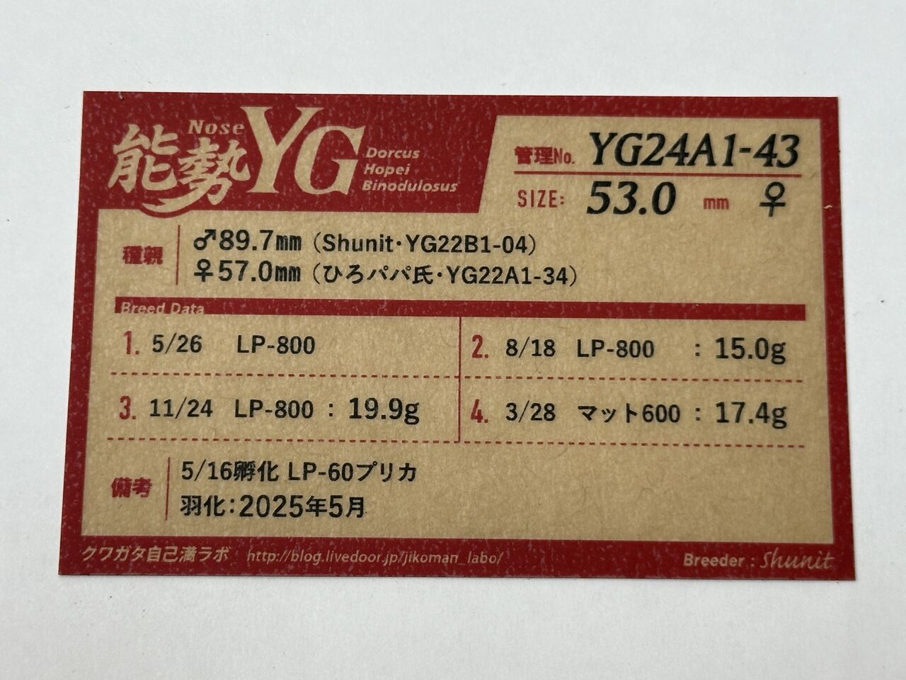 ♀53.0mm(YG24A1-43)2025年5月羽化、後食済み