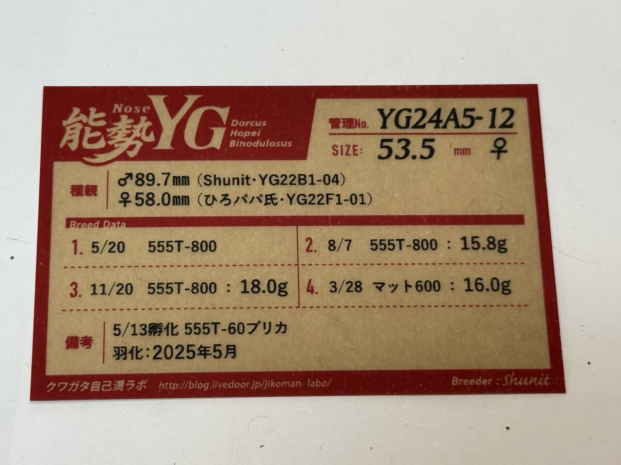 ♀53.5mm(YG24A5-12)2025年5月羽化、後食済み