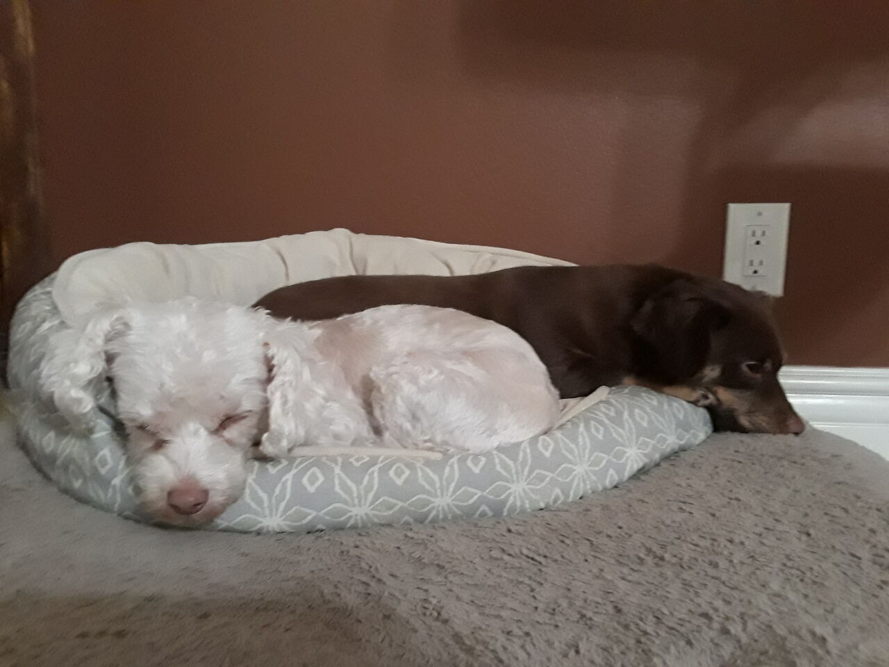 これが兄妹だってんだからビックリ!?まったく別の犬種のミックスに見えるけども、まごうことなき同じ親から生まれた兄妹。シェルターから一匹だけアダプトするつもりが、ピッタリとくっついて離れないから一緒に引き取られてきたらしい。